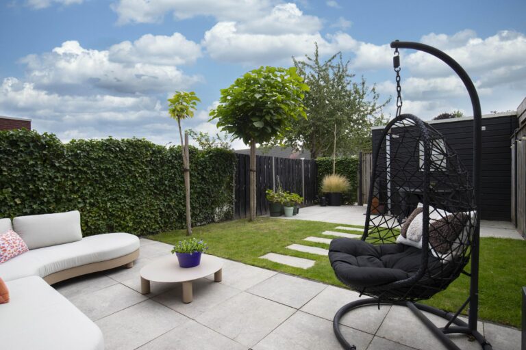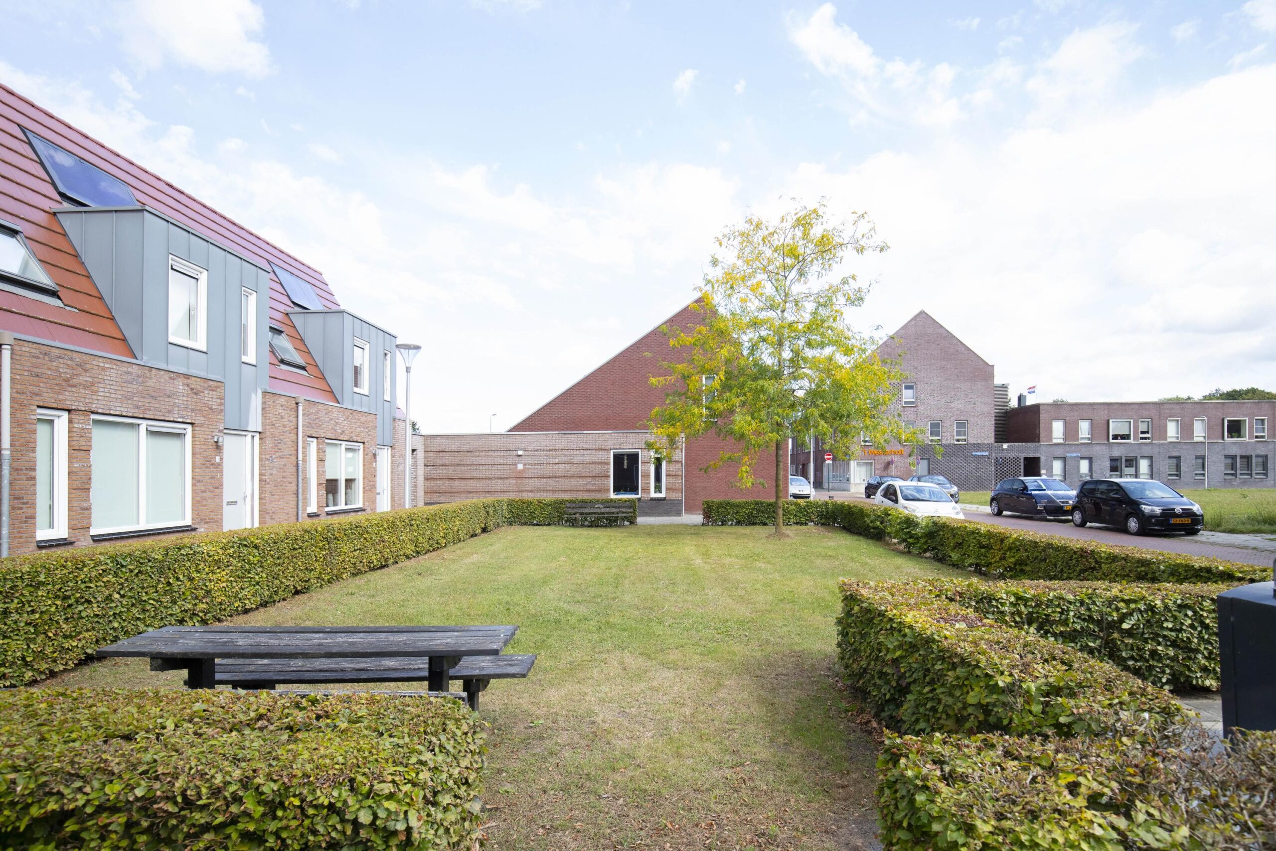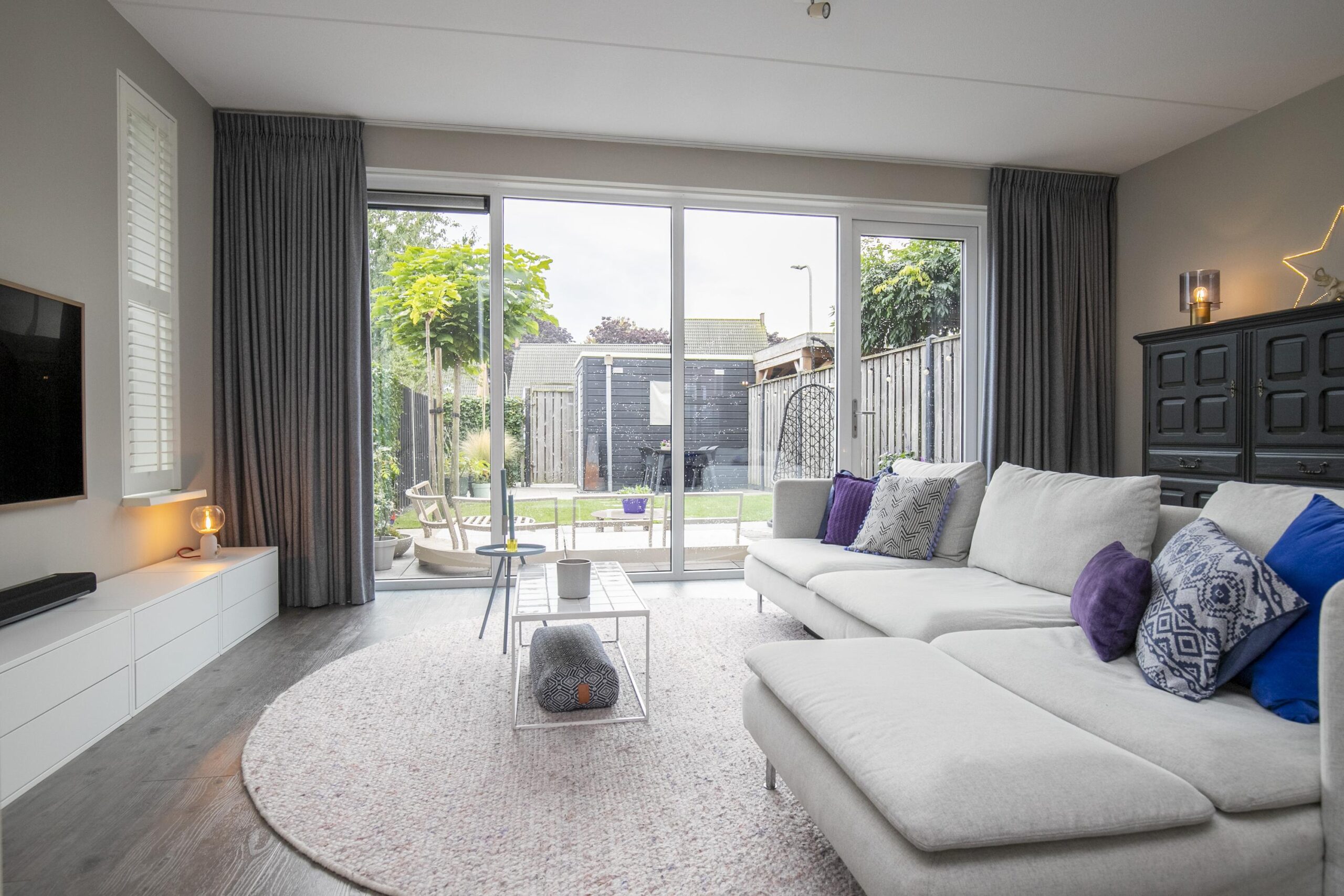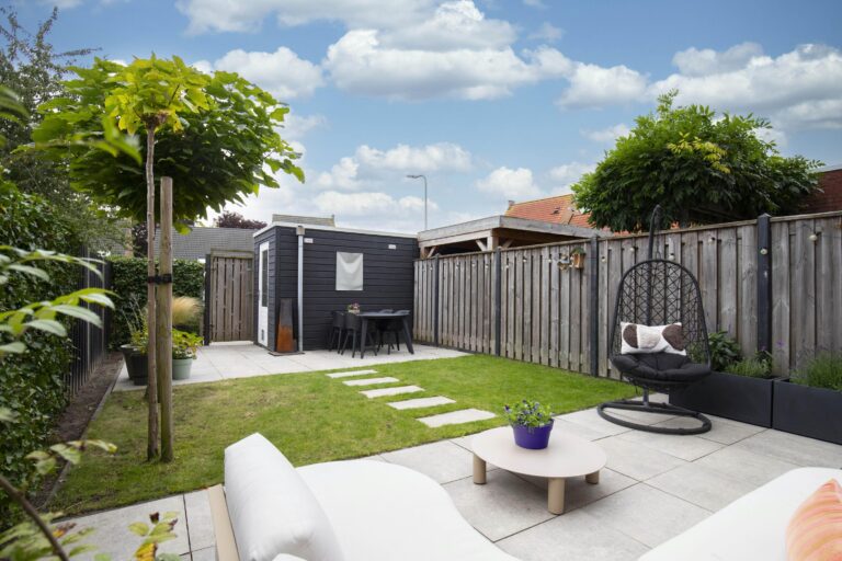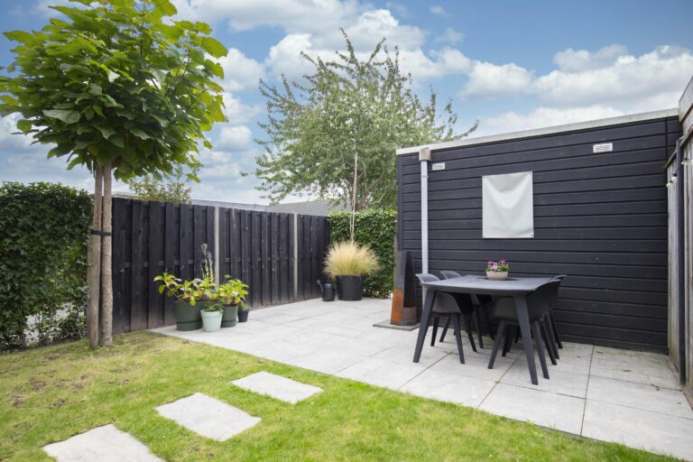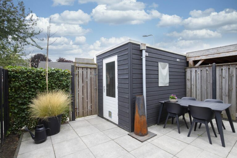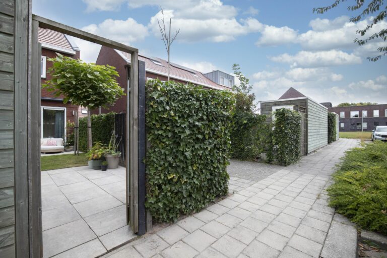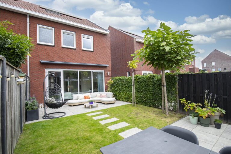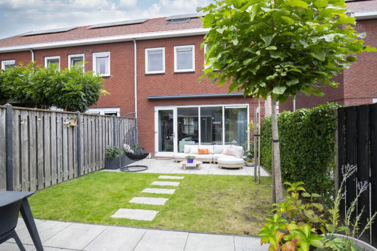De achtertuin is een heerlijke plek om te genieten van het buitenleven. Fraai aangelegd met een terras, gazon en een uitvalscherm zodat je altijd een beschut plekje hebt. Achter in de tuin staat een praktische berging voor fietsen en tuingereedschap, en via de achterom loop je zo naar de parkeerplaatsen. Hier is bovendien een openbare laadpaal beschikbaar voor je elektrische auto.