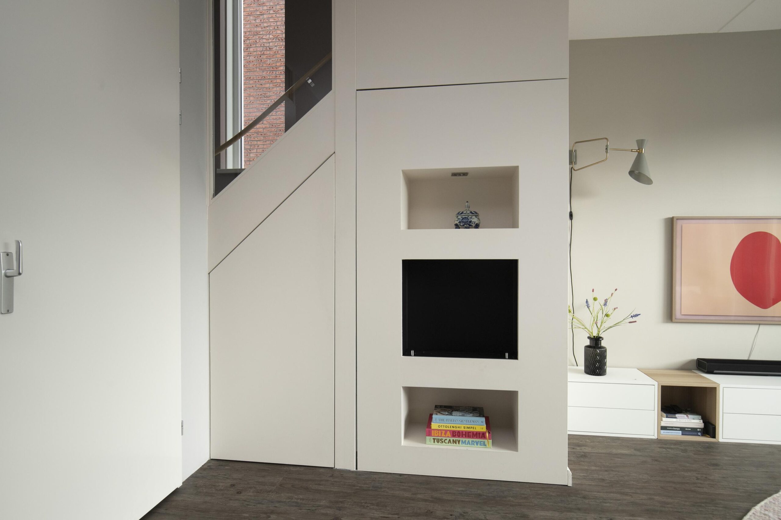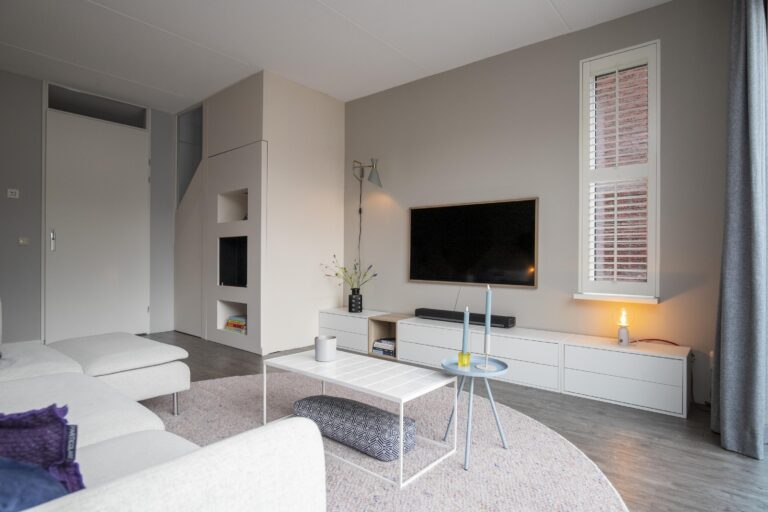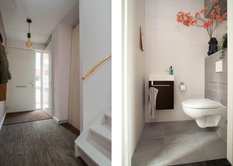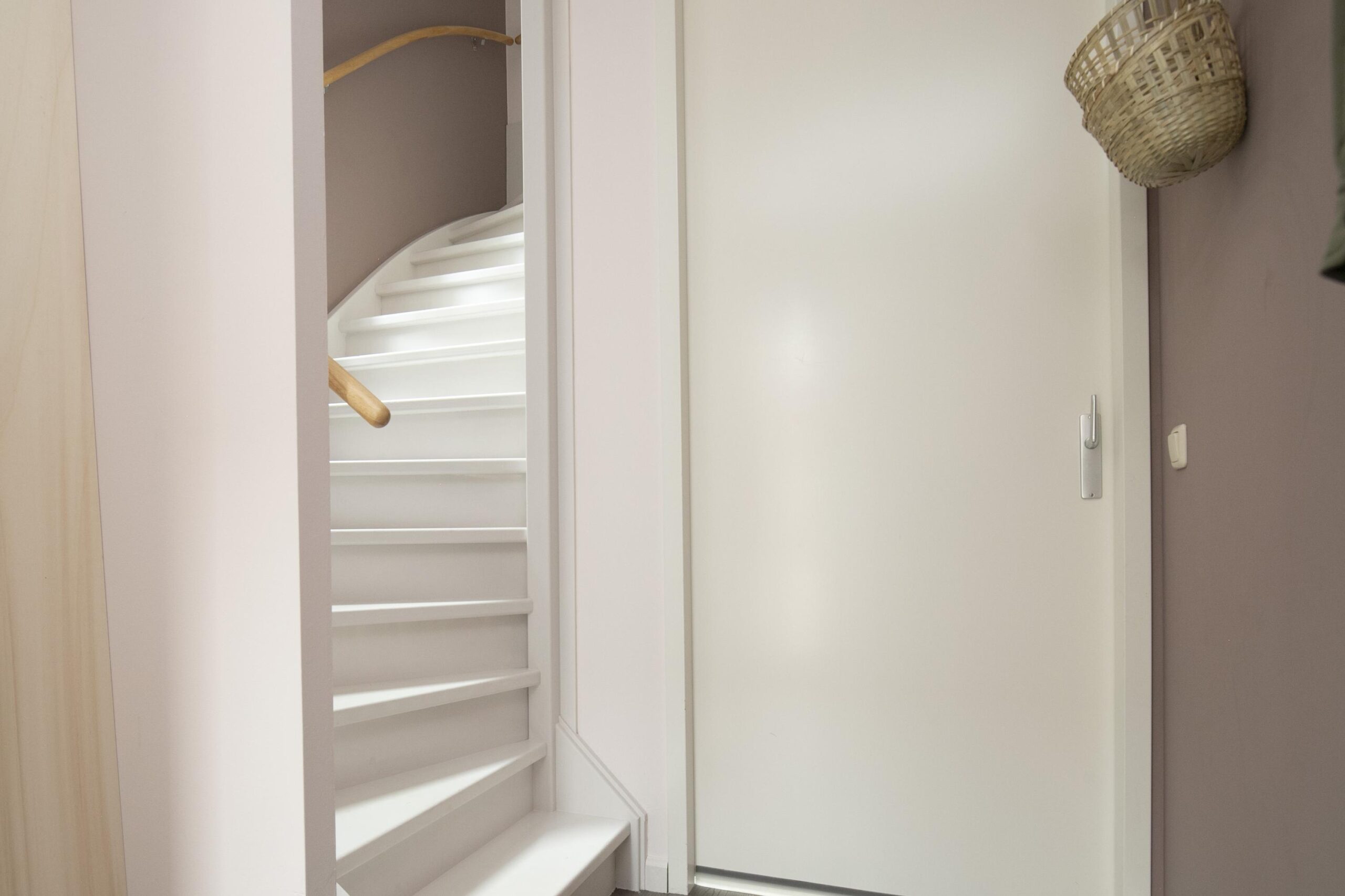Bij binnenkomst valt direct de lichte en moderne uitstraling op. De hal geeft toegang tot het toilet, de trapopgang en de woonkamer. Hier kun je heerlijk ontspannen bij de sfeervolle bio-ethanolhaard, terwijl de grote glazen pui aan de achterzijde zorgt voor veel daglicht en verbinding met de tuin.