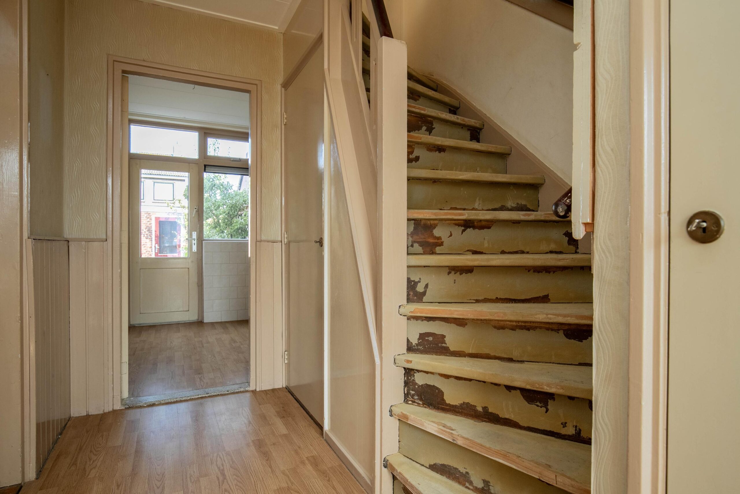 Begane grond: Hal met toilet, trapkast, woonkamer, afzonderlijke keuken met eenvoudig keukenblokje.