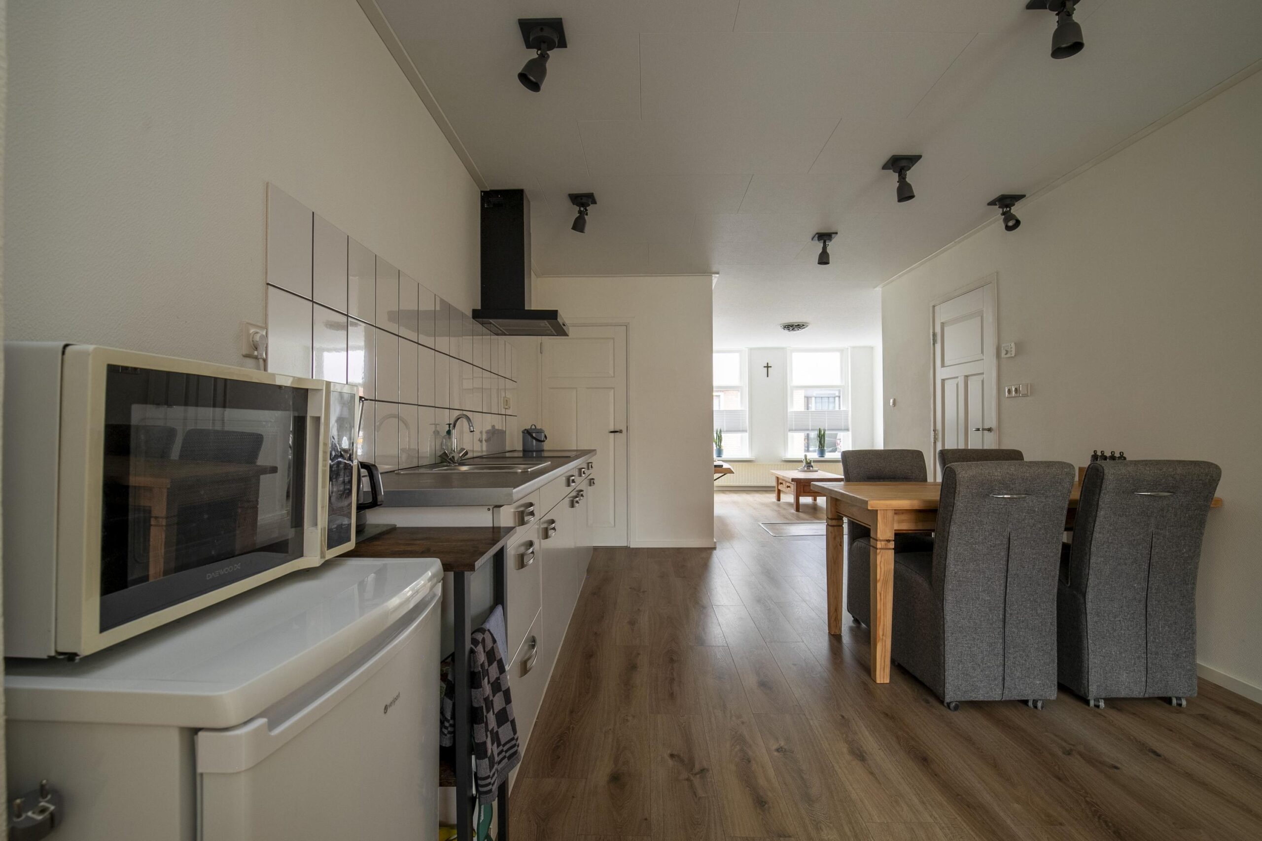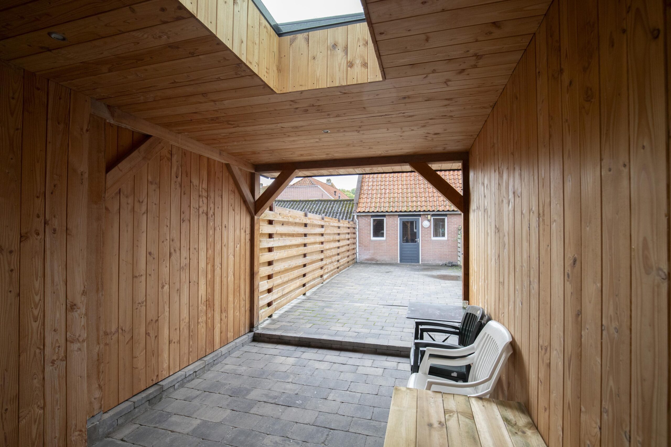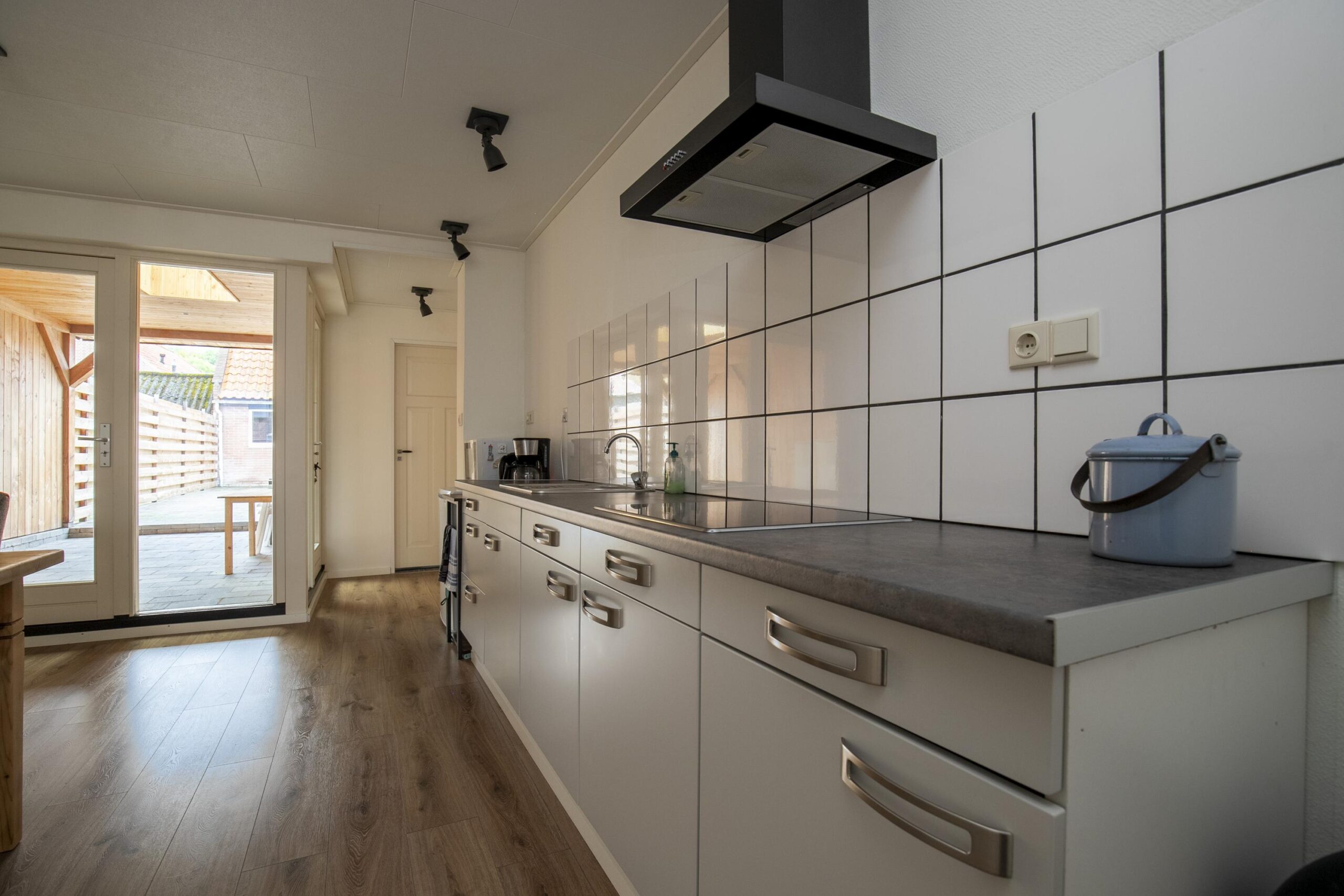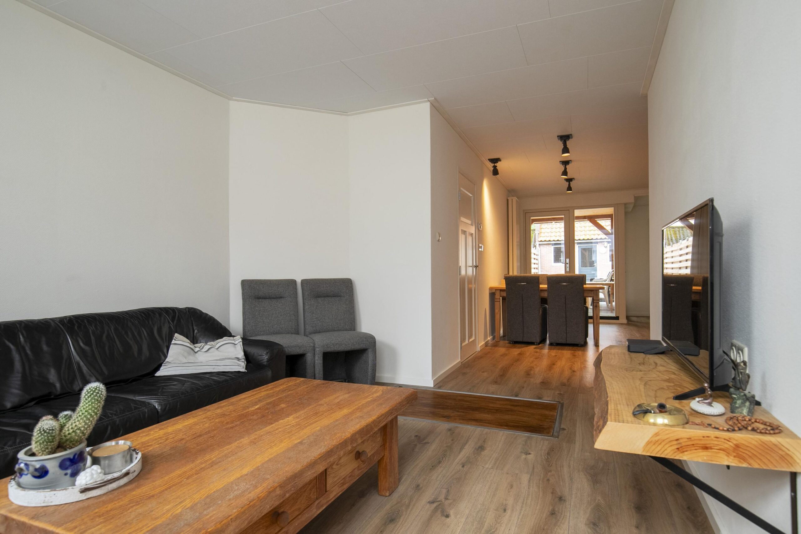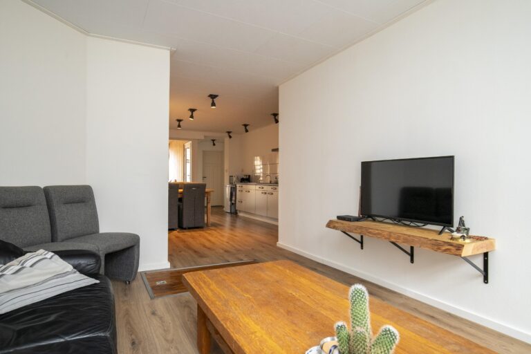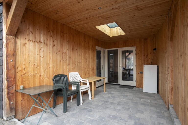 De ruime woonkamer met open keuken vormt het hart van het huis – hier geniet je van gezellige etentjes, borrels of een ontspannen avond op de bank. Via de tuindeuren stap je zo onder de overkapping of de zonnige achtertuin op het zuiden, waar je heerlijk kunt genieten van lange zomerdagen.