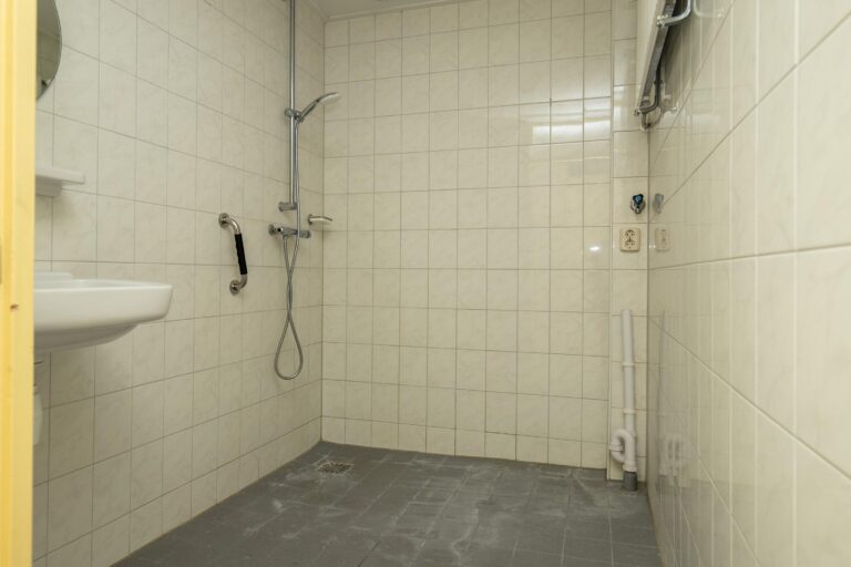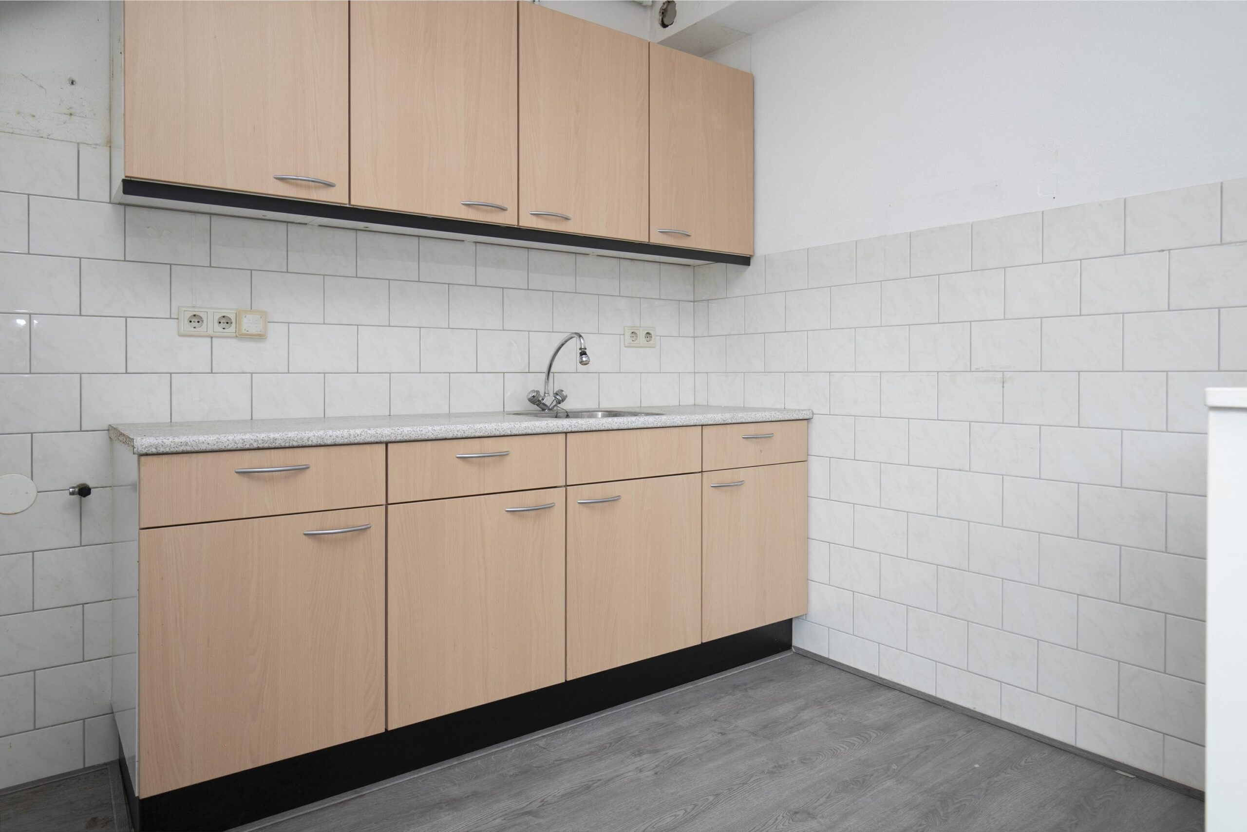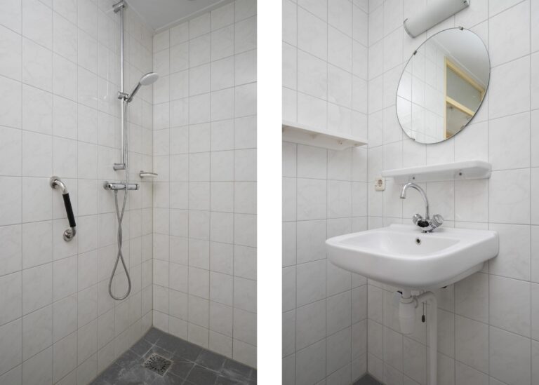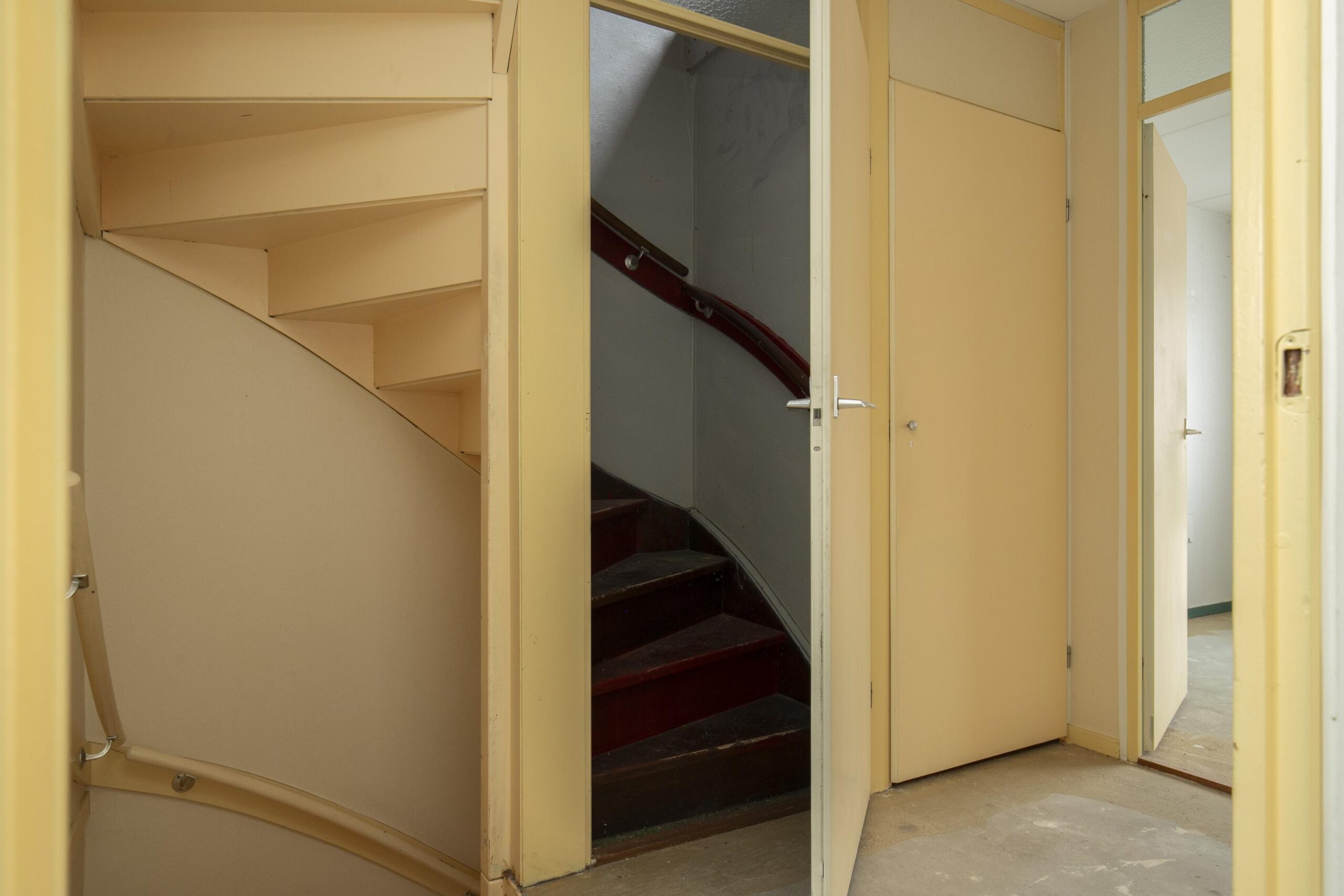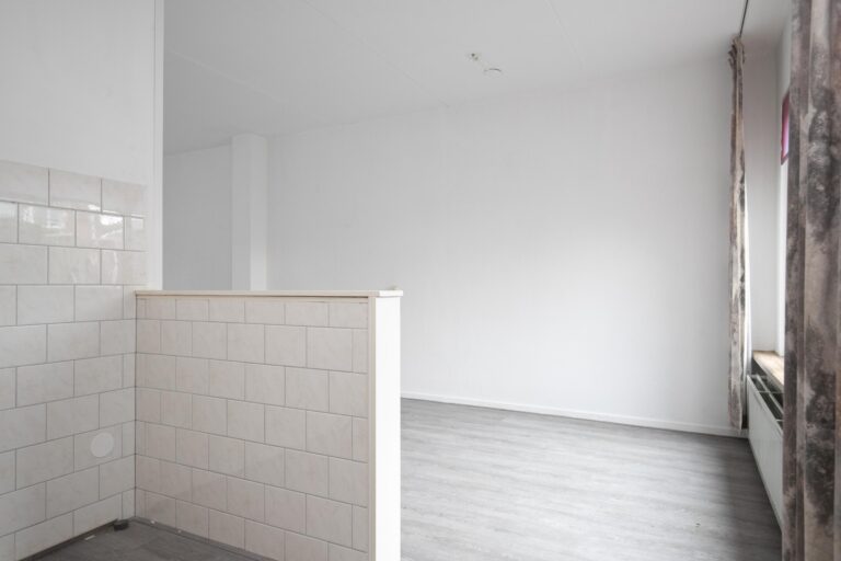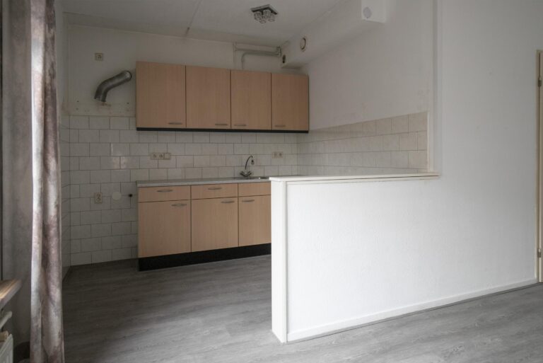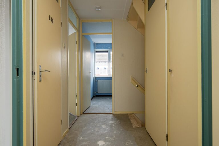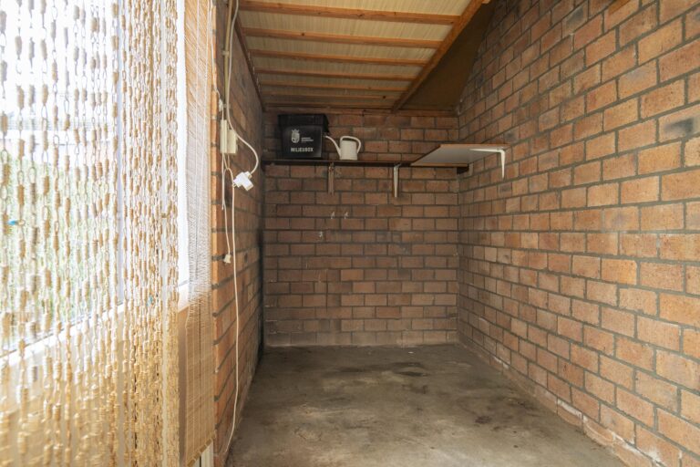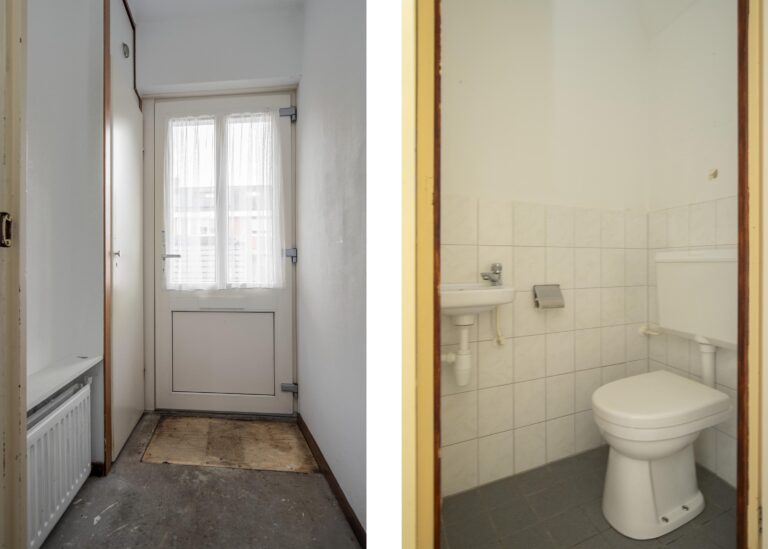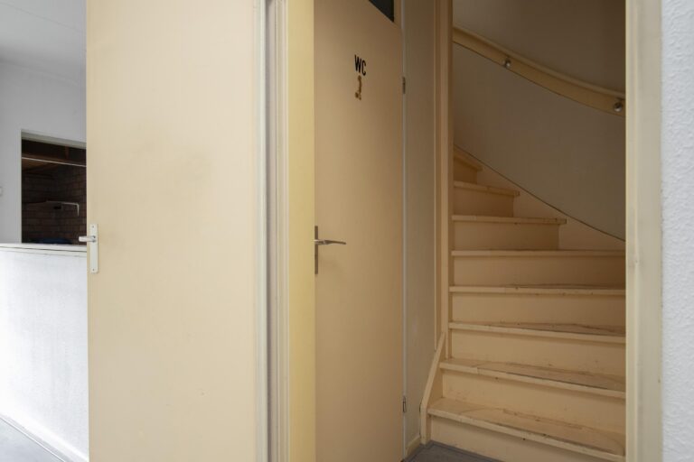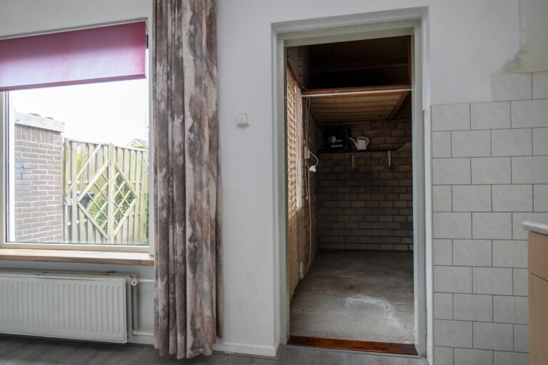 Aangrenzend bevindt zich de bijkeuken, die extra bergruimte biedt en toegang geeft tot de tuin via een enkele deur. Vanuit de tussenhal bereik je de toiletruimte, voorzien van een staand toilet en fonteintje. Tevens bevindt zich hier de vaste trapopgang naar de eerste verdieping.