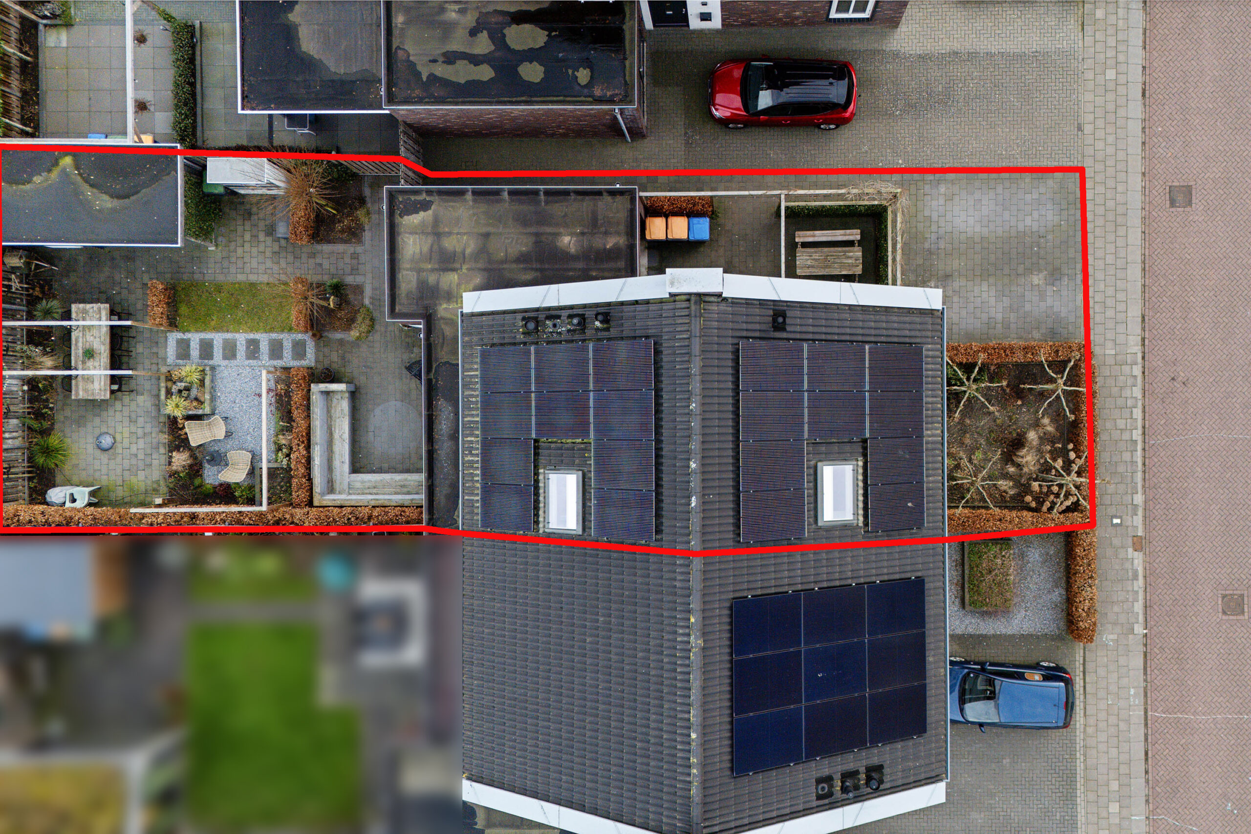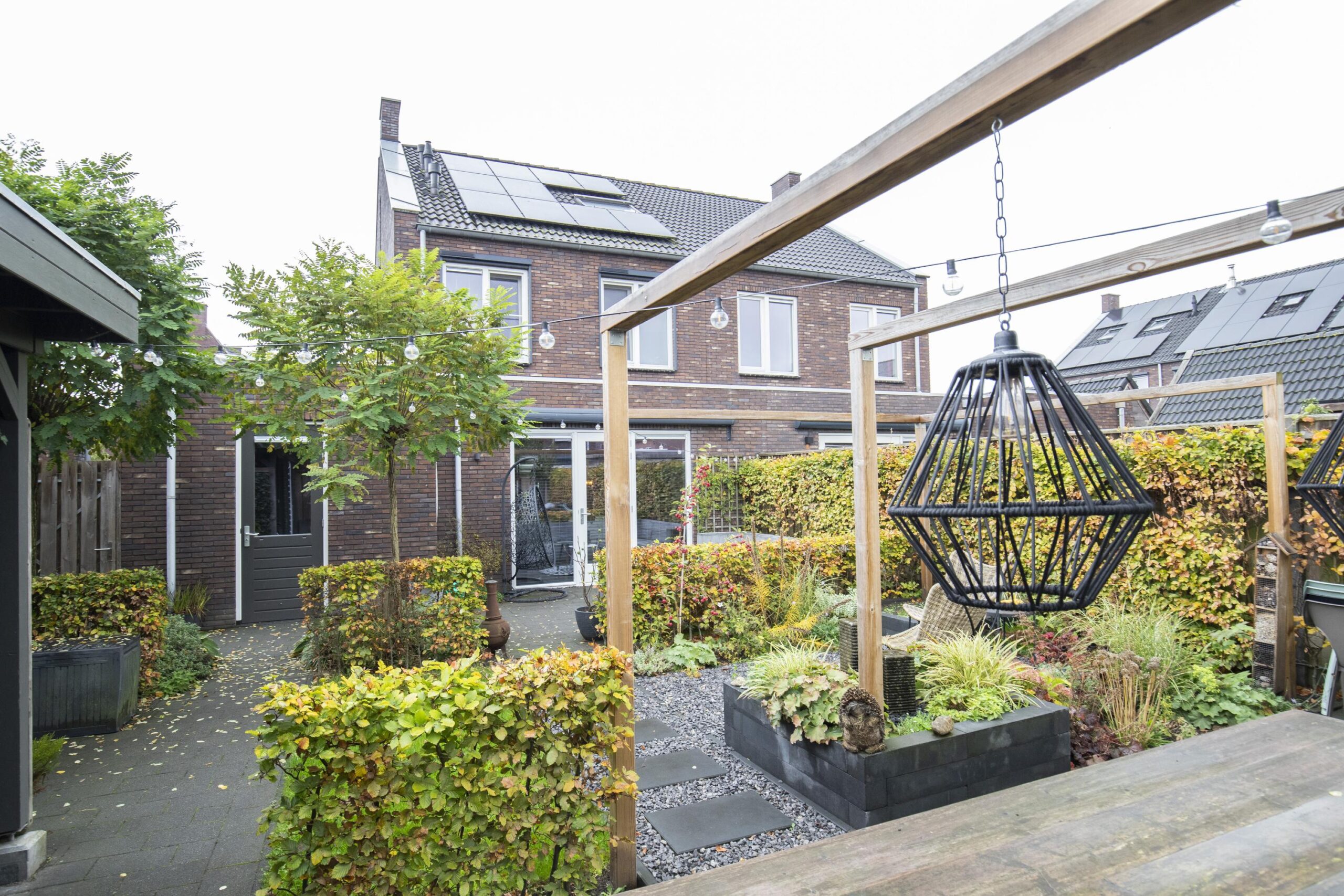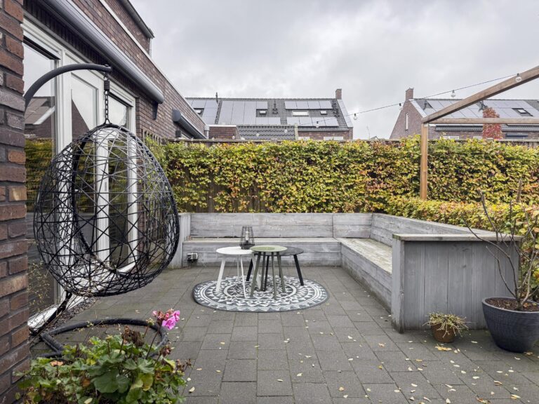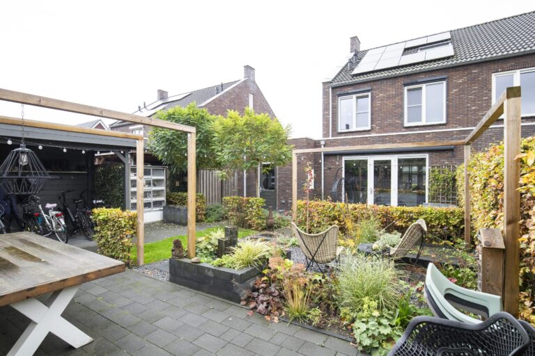 De tuin is een fijne plek om te ontspannen en heeft een gunstige zonligging. Er zijn meerdere zitjes gecreëerd zodat je op elk moment van de dag van de zon of schaduw kunt genieten. Een zonnescherm zorgt voor extra comfort op warme dagen. Daarnaast is er een overkapping aanwezig en een schuur voor bijvoorbeeld fietsen en tuinspullen. De tuin is bereikbaar vanuit de woning, maar ook via een achterom en het pad naast de woning.