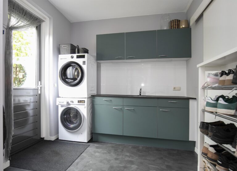 De keuken is heerlijk licht dankzij de grote raampartijen en de openslaande deuren naar de tuin. Vanuit de keuken bereik je de praktische bijkeuken met aansluitingen voor wasmachine en droger en een extra keukenblok. Vanuit hier is er toegang tot een extra bergruimte en een deur naar de tuin, wat zorgt voor veel praktische gebruiksmogelijkheden.