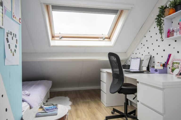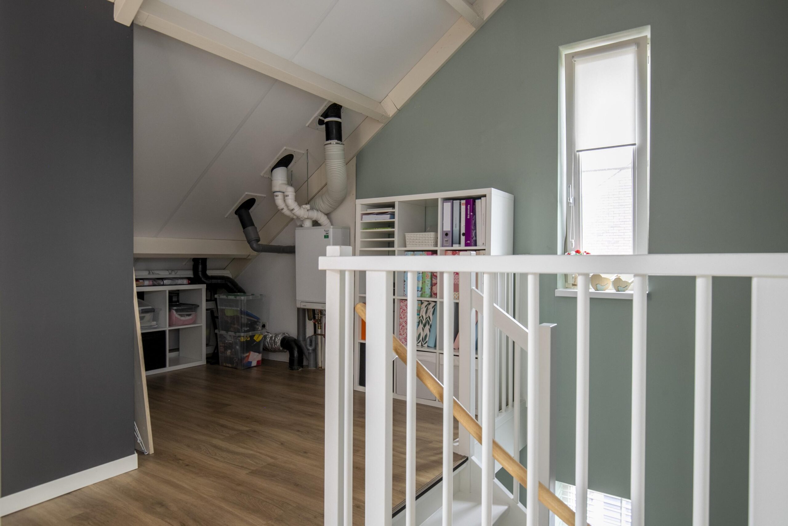 Middels een vaste trap bereik je de ruime tweede verdieping. Hier bevinden zich nog twee extra kamers met tuimelramen, ideaal als slaap-, werk- of hobbykamer. De overloop is ruim en biedt daarnaast toegang tot een extra bergruimte, waardoor je volop praktische opslagmogelijkheden hebt.