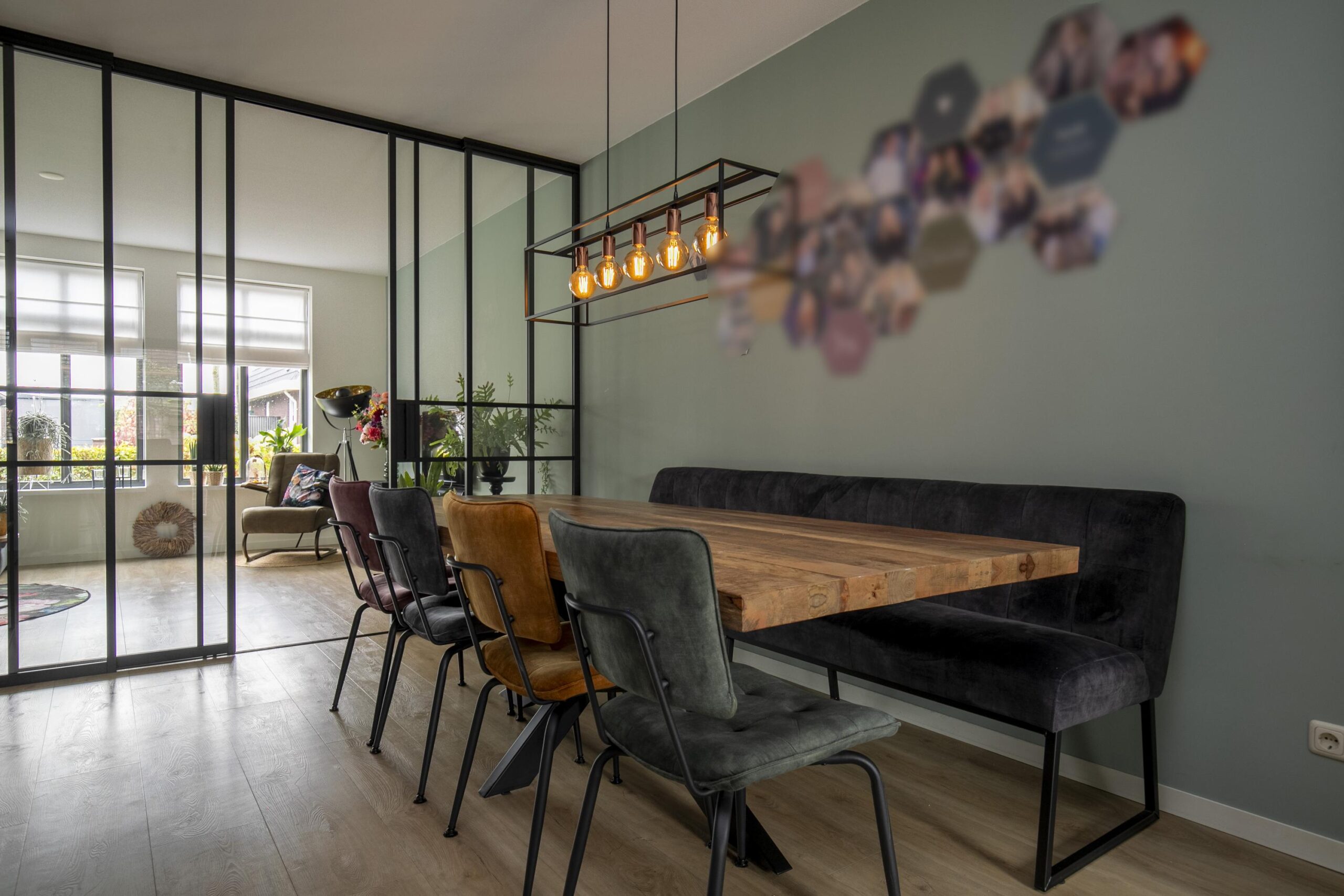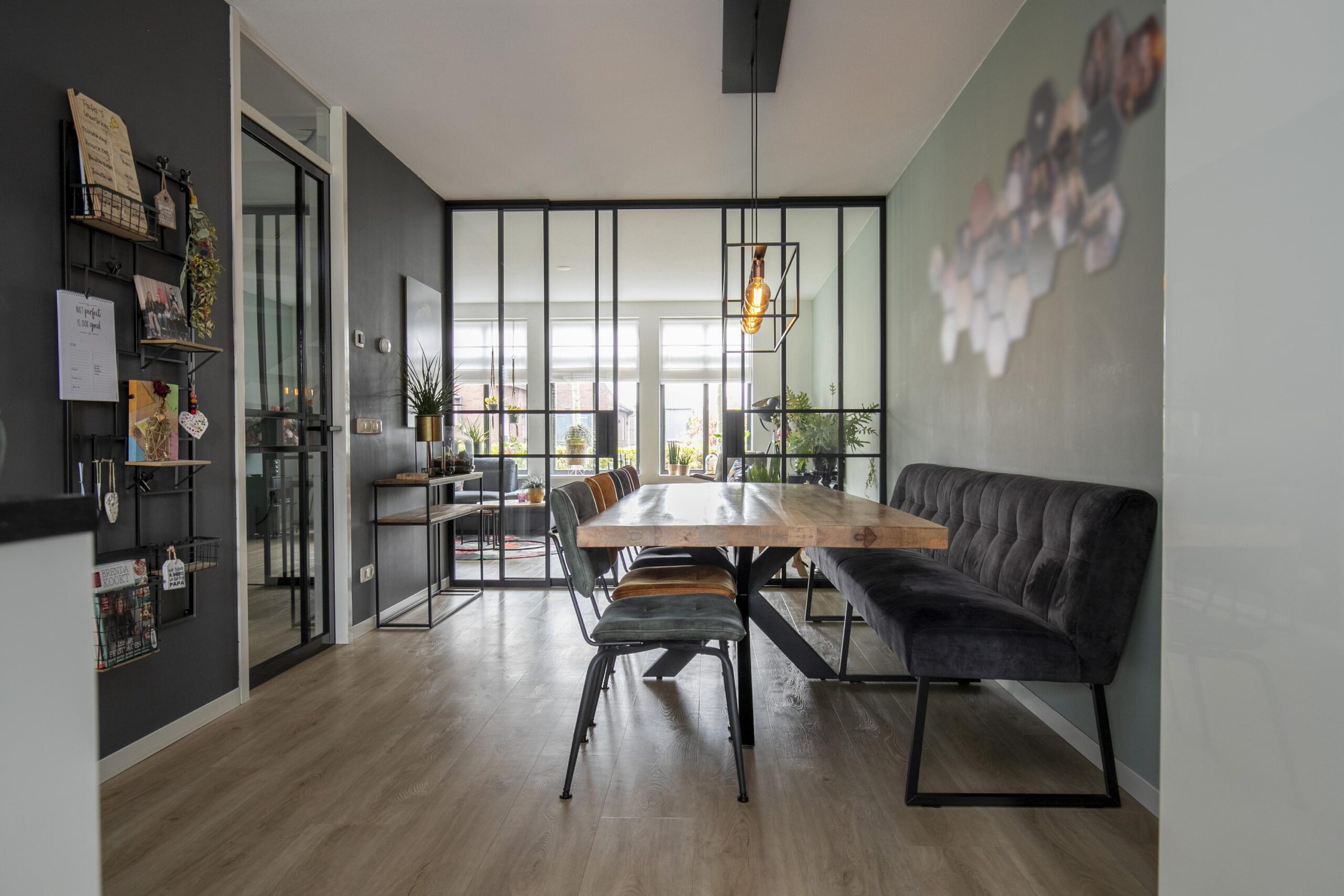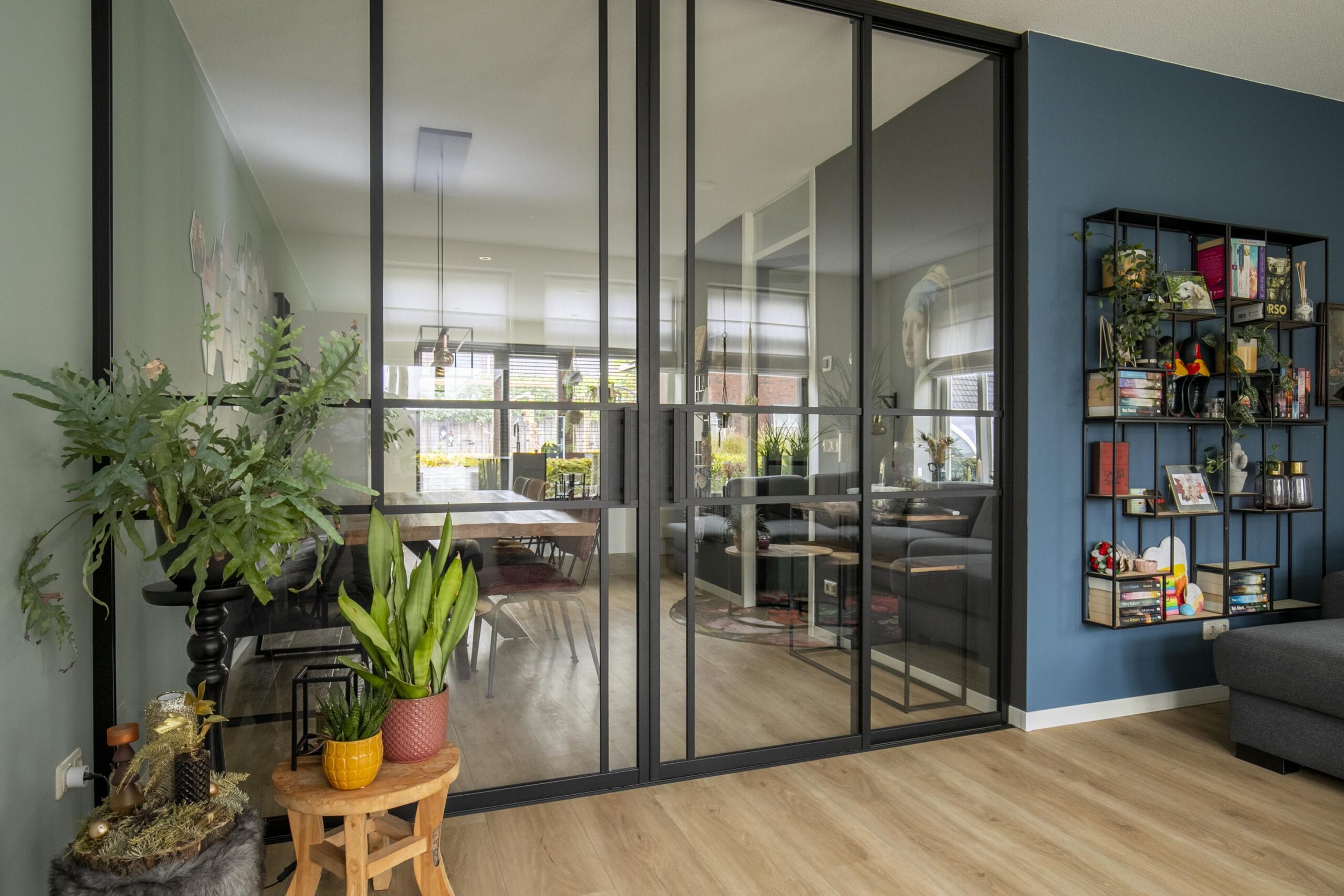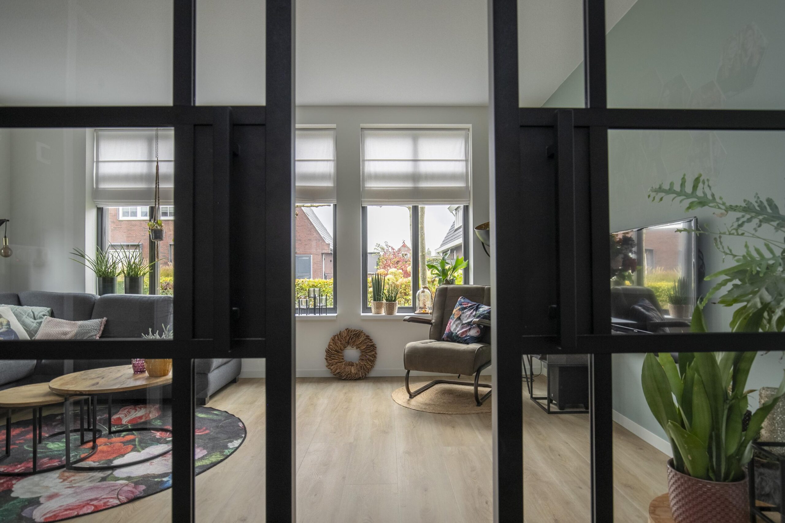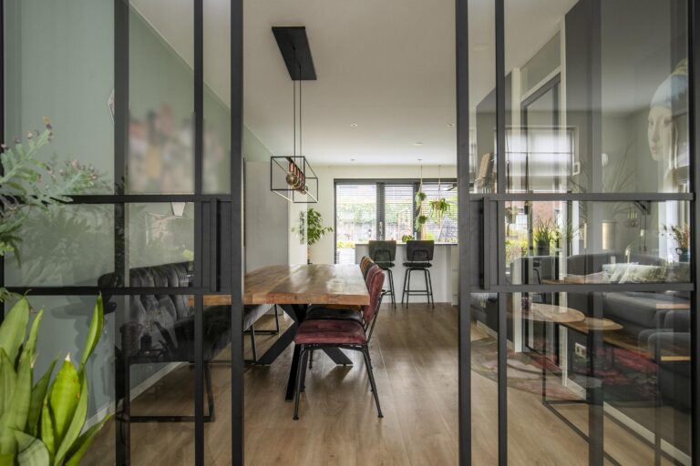 Je komt de woning binnen via de hal/ entree, waar zich de toiletruimte en de vaste trap naar de verdiepingen bevinden. Bij binnenkomst in de woonkamer valt direct de ruimte op. De woonkamer is gelegen aan de voorzijde en kan middels stijlvolle glazen en suite deuren worden afgesloten als aparte zitruimte. Hierdoor kun je eenvoudig kiezen tussen een open leefruimte of juist een knusse, afgesloten woonkamer.