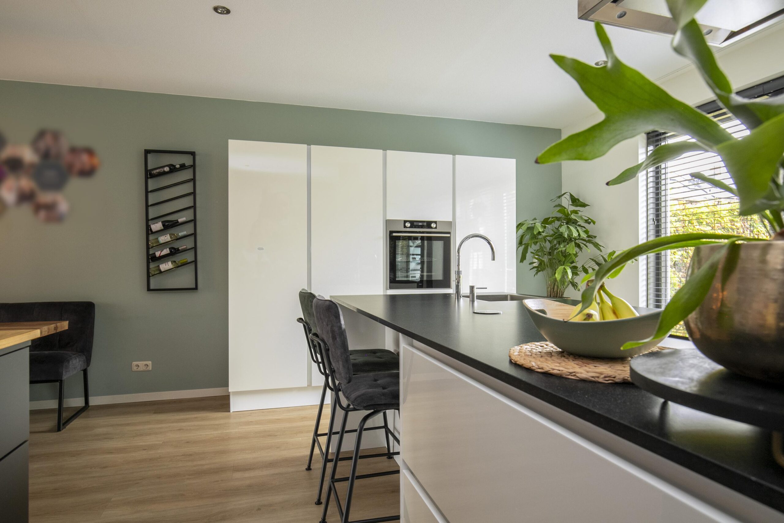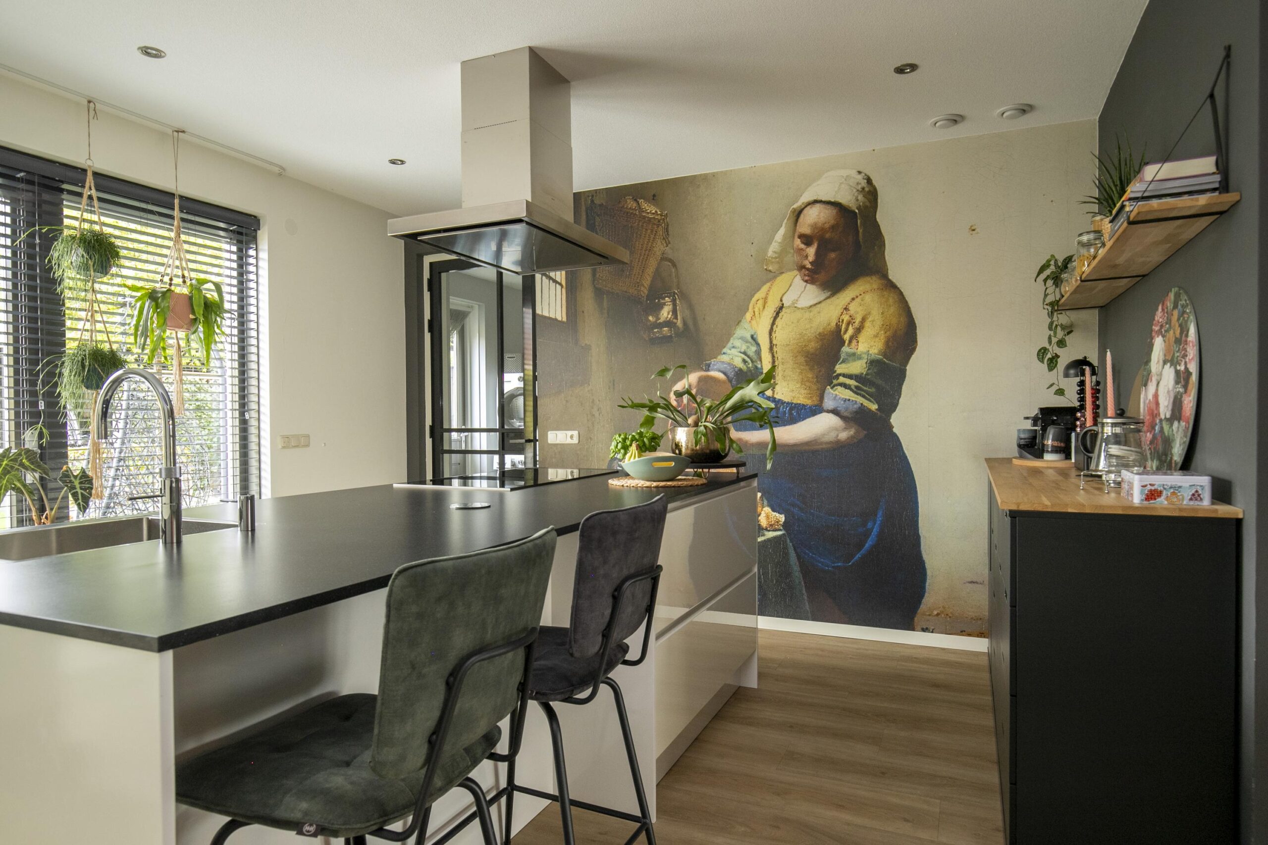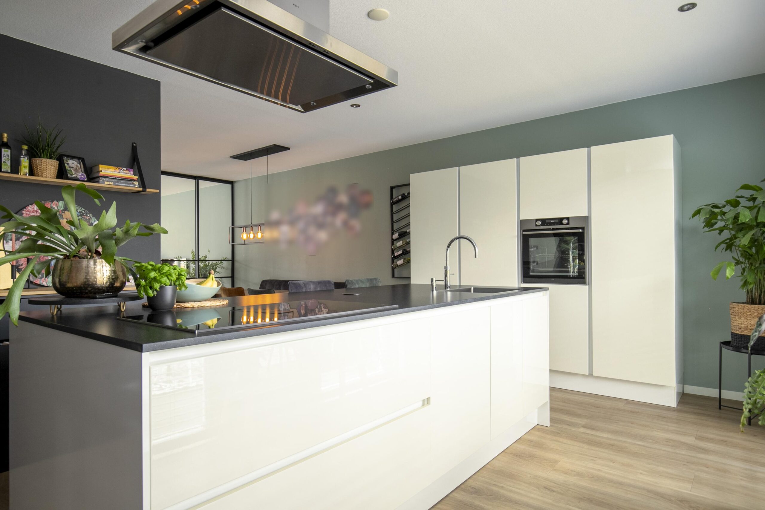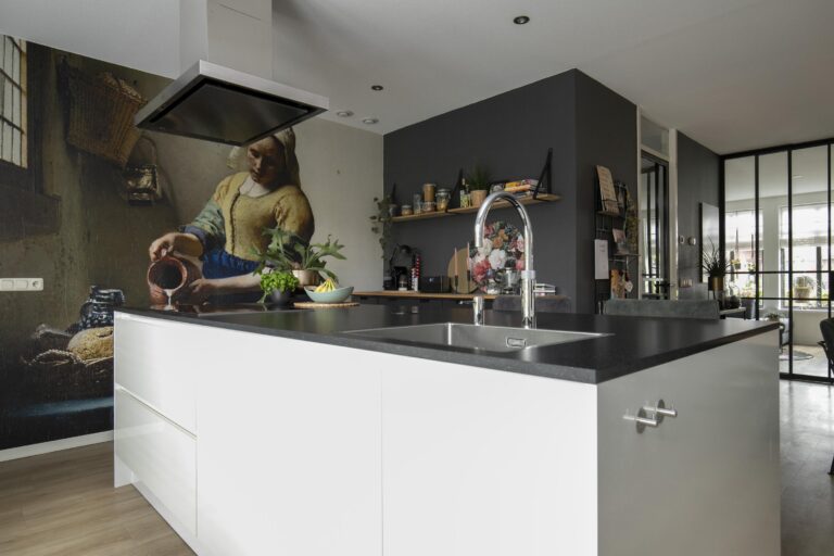 Aan de achterzijde is de woning uitgebouwd en hier bevindt zich de luxe woonkeuken. Dit is de centrale plek van het huis waar je samenkomt met familie en vrienden om te koken, te eten en te borrelen. De keuken is ruim opgezet en voorzien van diverse inbouwapparatuur, waaronder een kookeiland met grote inductiekookplaat, een heetwaterkraan (Quooker), vaatwasser, oven en een grote koelkast. Er is veel opbergruimte aanwezig en het royale werkblad biedt voldoende plek om te koken en te bereiden. Aan het eiland kun je plaatsnemen op barkrukken, ideaal voor een ontbijt in de ochtend of een gezellige borrel in het weekend.
