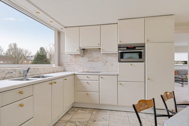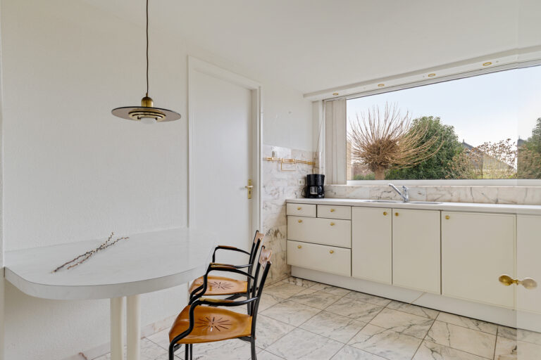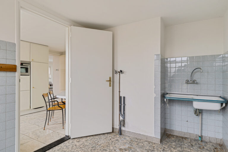 Aangrenzend aan de woonkamer bevindt zich de keuken. Deze is functioneel ingericht en biedt uitzicht op de tuin. De keuken sluit aan op de bijkeuken, waar extra bergruimte en aansluitingen voor witgoed aanwezig zijn. Vanuit de bijkeuken is er tevens een praktische doorloop binnen de woning.