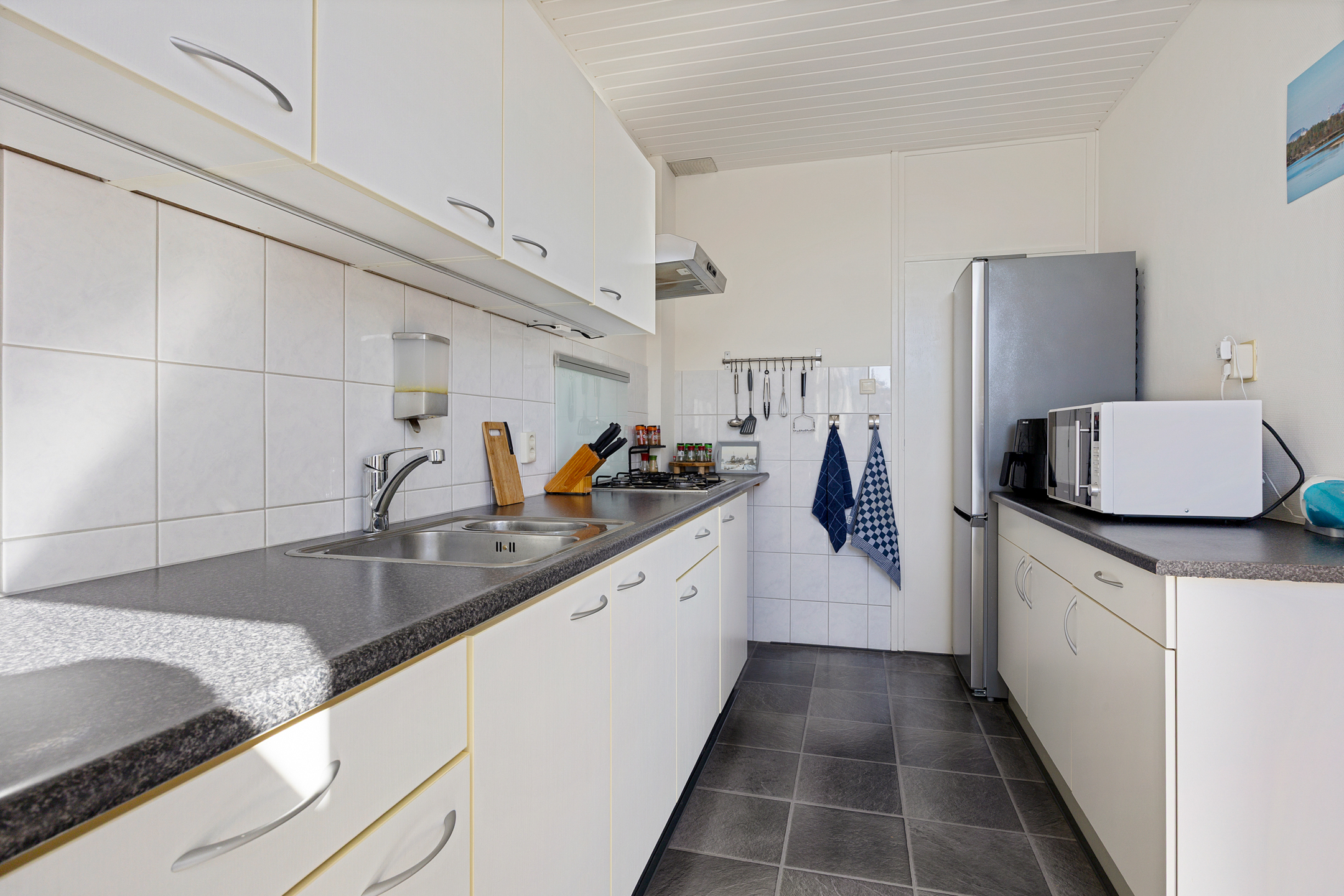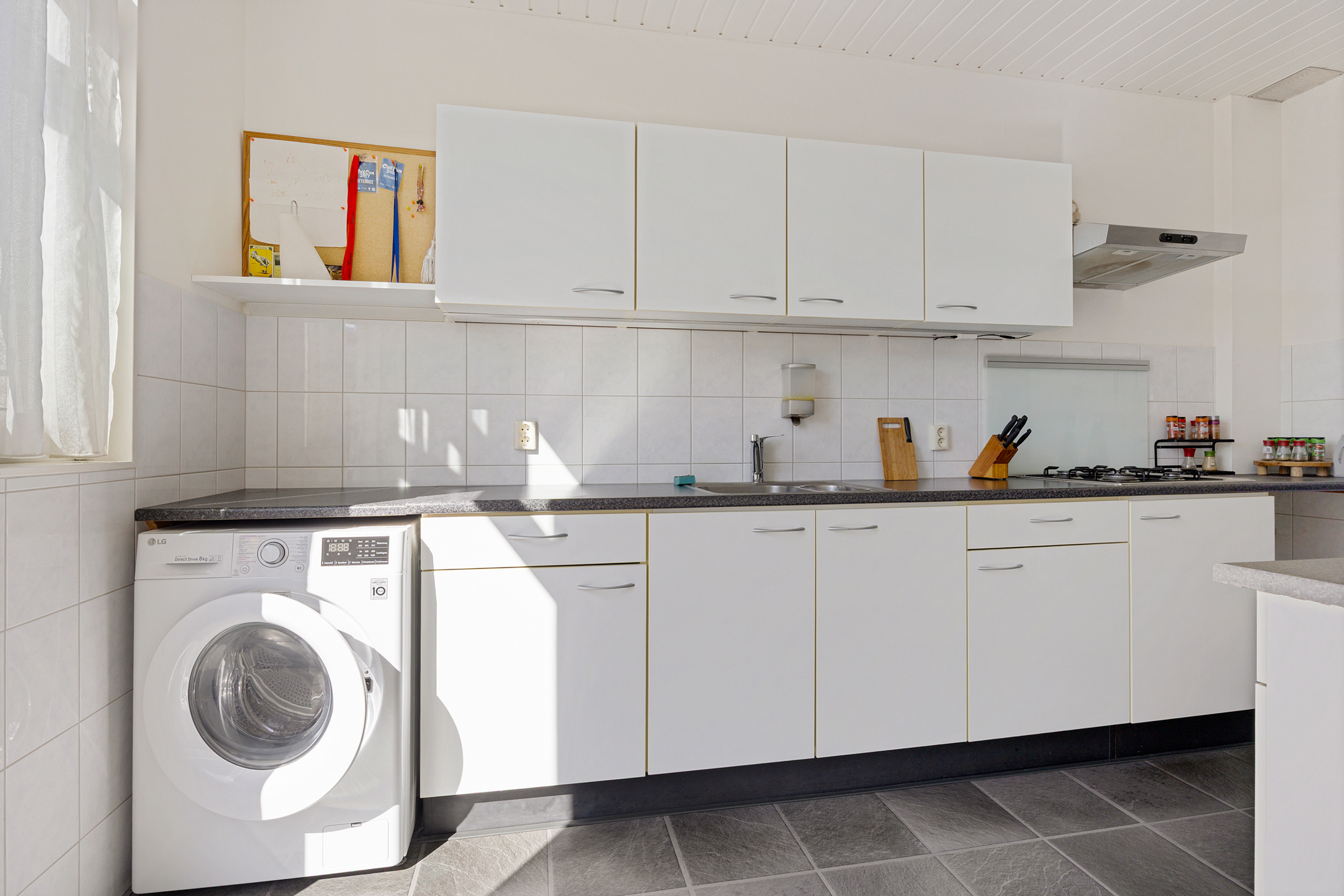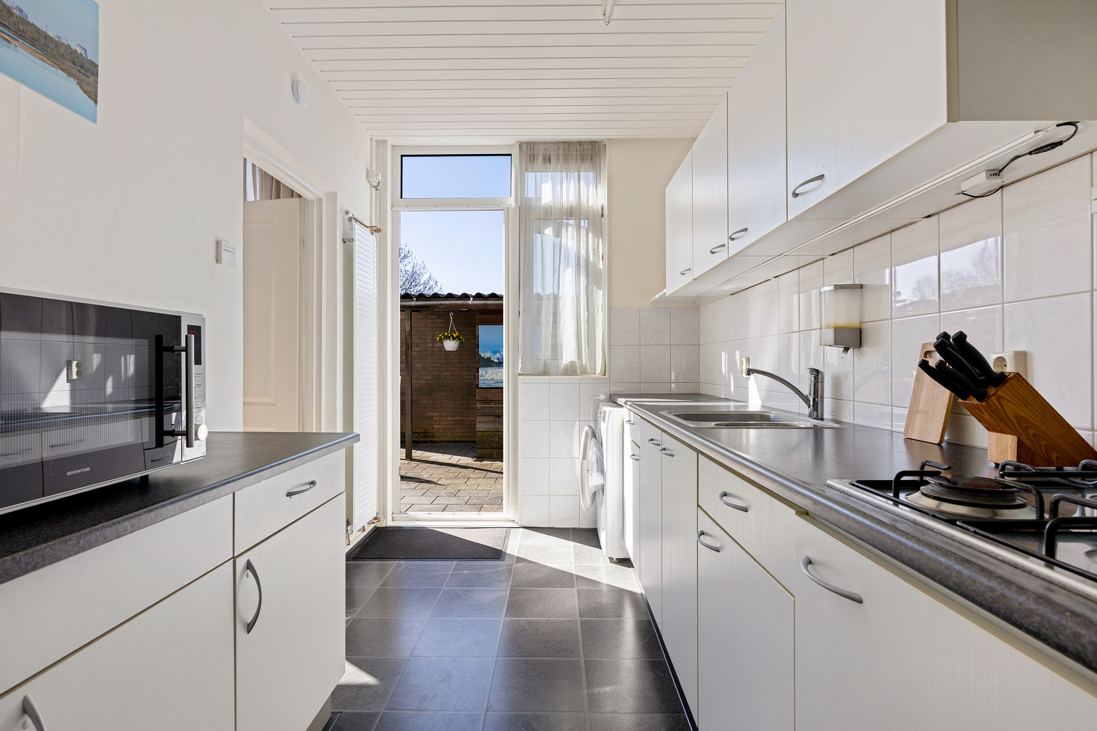 Aan de achterzijde van de woning bevindt zich de keuken. Deze is praktisch ingericht met een rechte opstelling en biedt voldoende werk- en bergruimte. Vanuit de keuken heb je direct toegang tot de achtertuin.