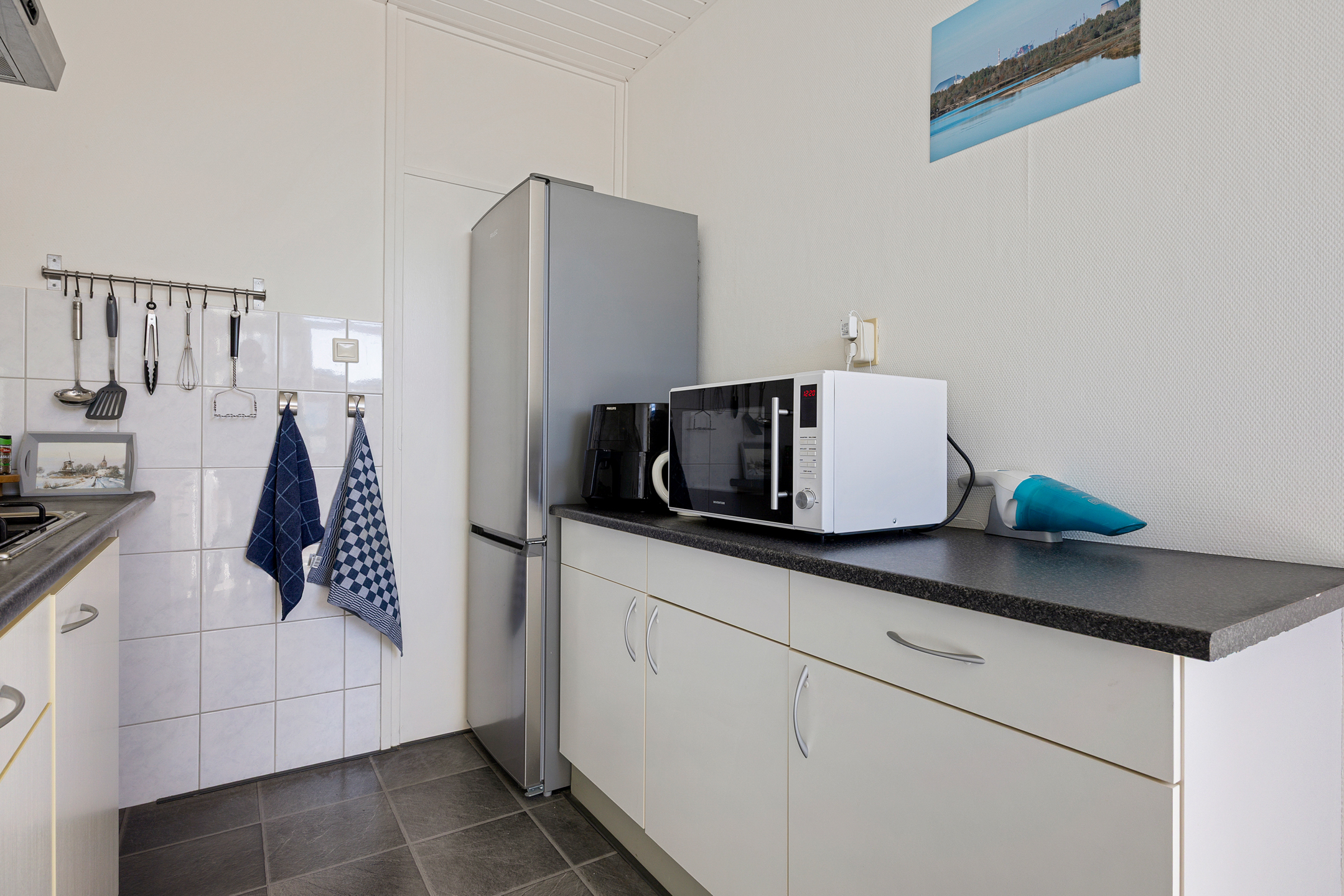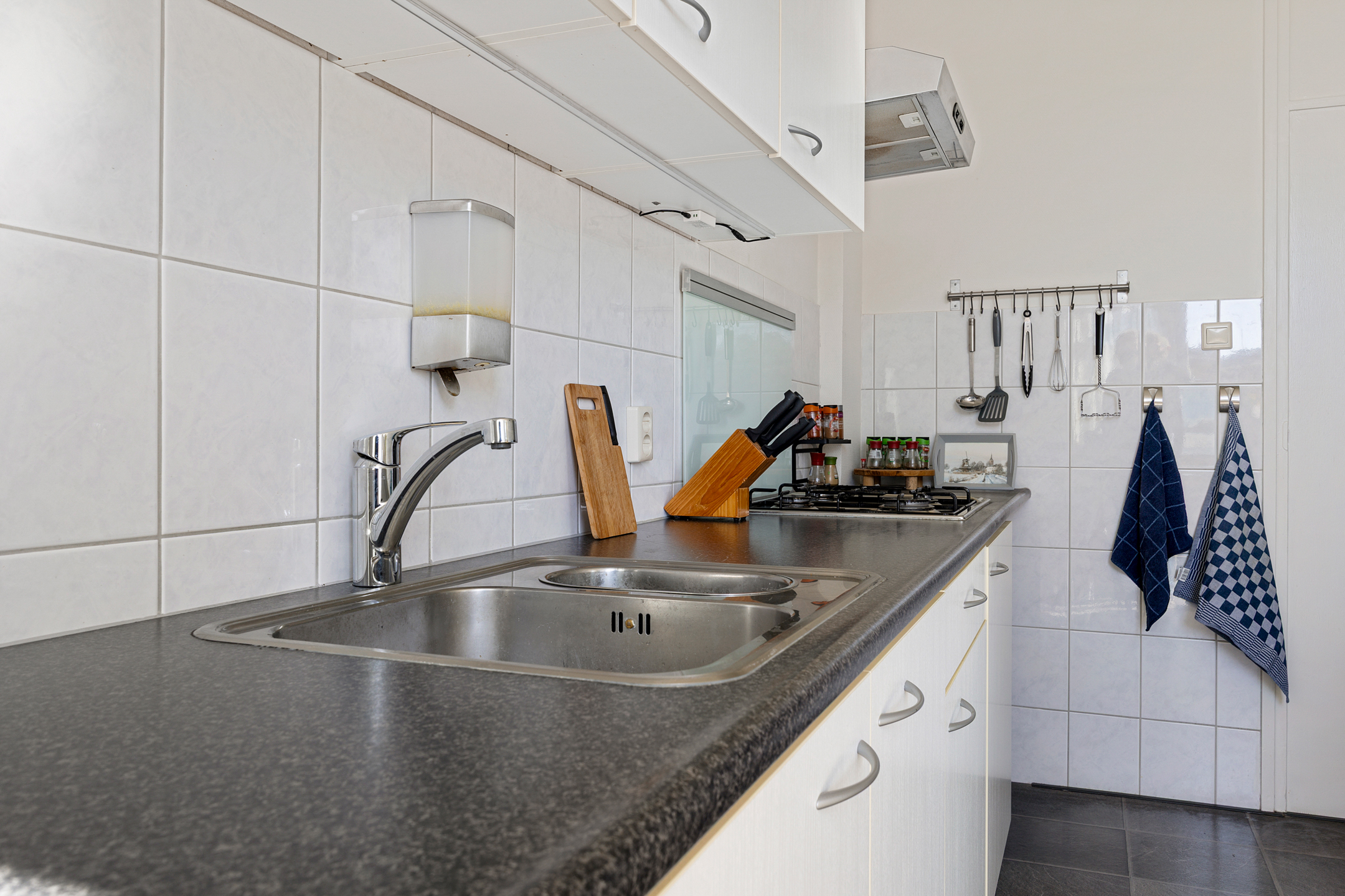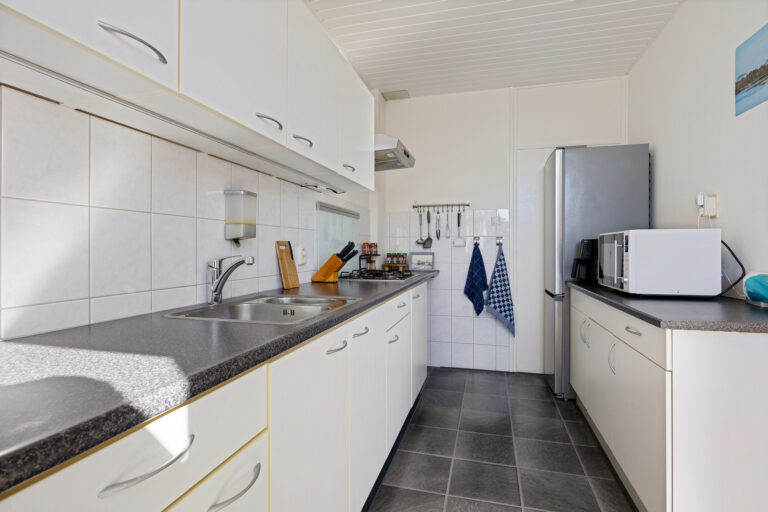 Aan de achterzijde van de woning bevindt zich de keuken. Deze is praktisch ingericht met een rechte opstelling en biedt voldoende werk- en bergruimte. Vanuit de keuken heb je direct toegang tot de achtertuin.