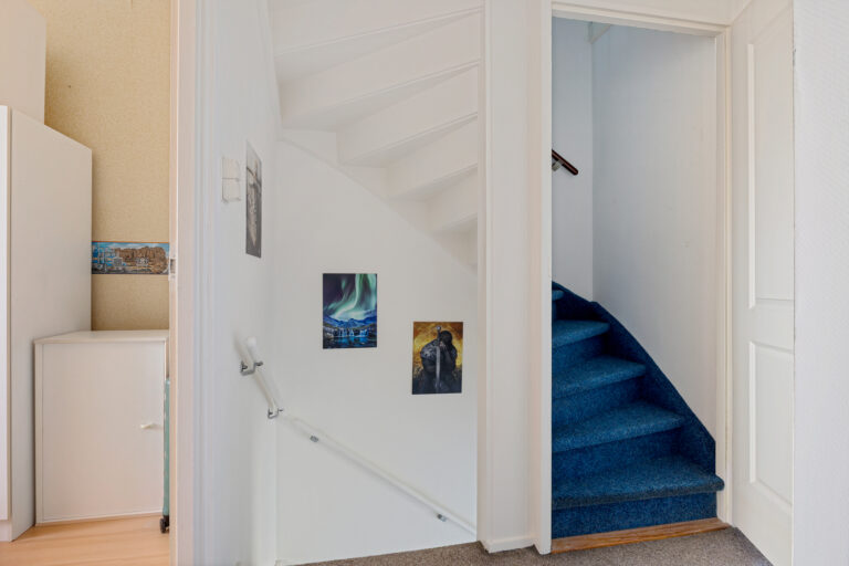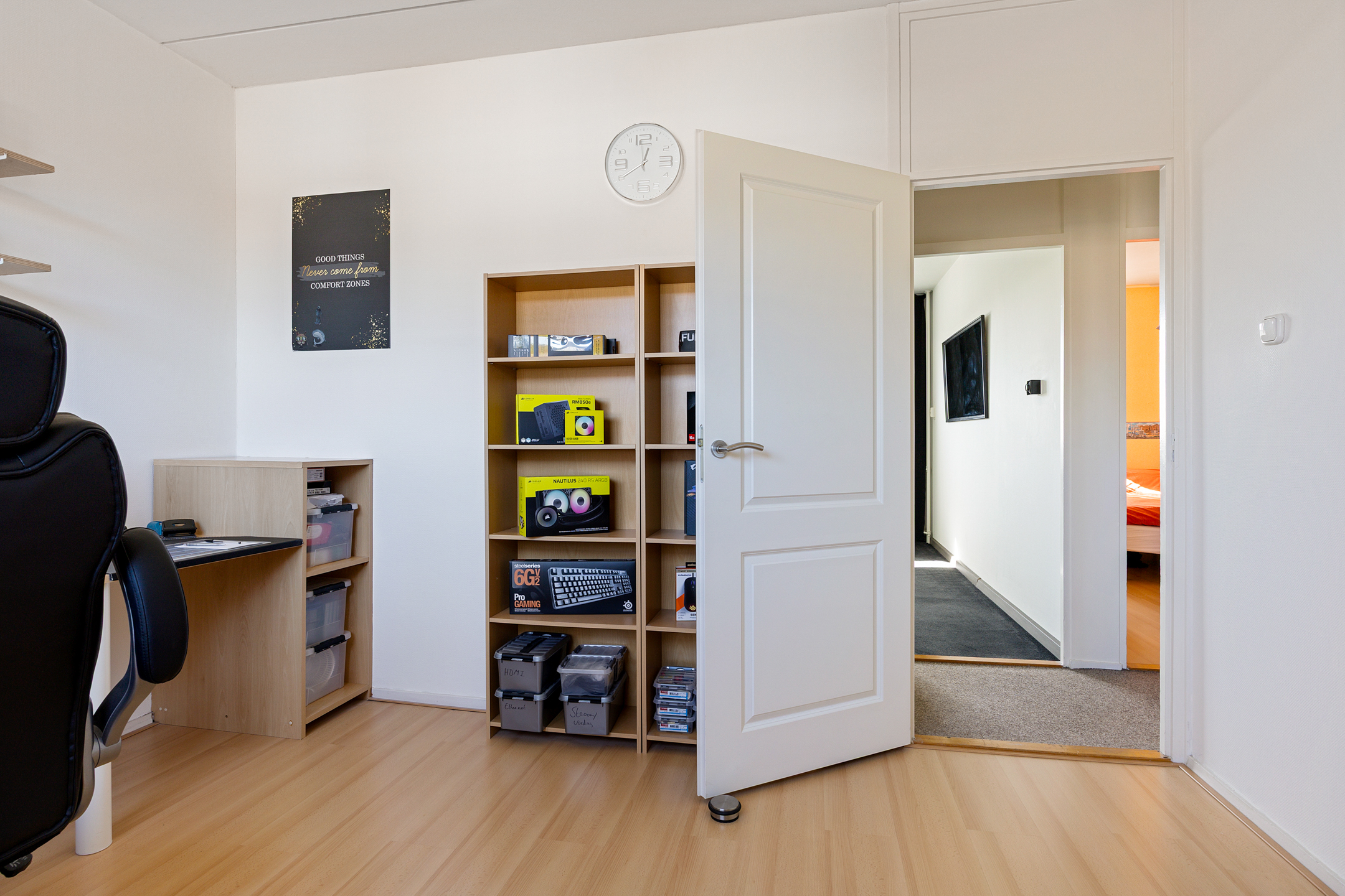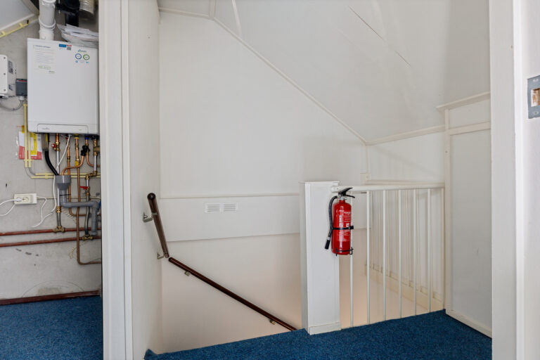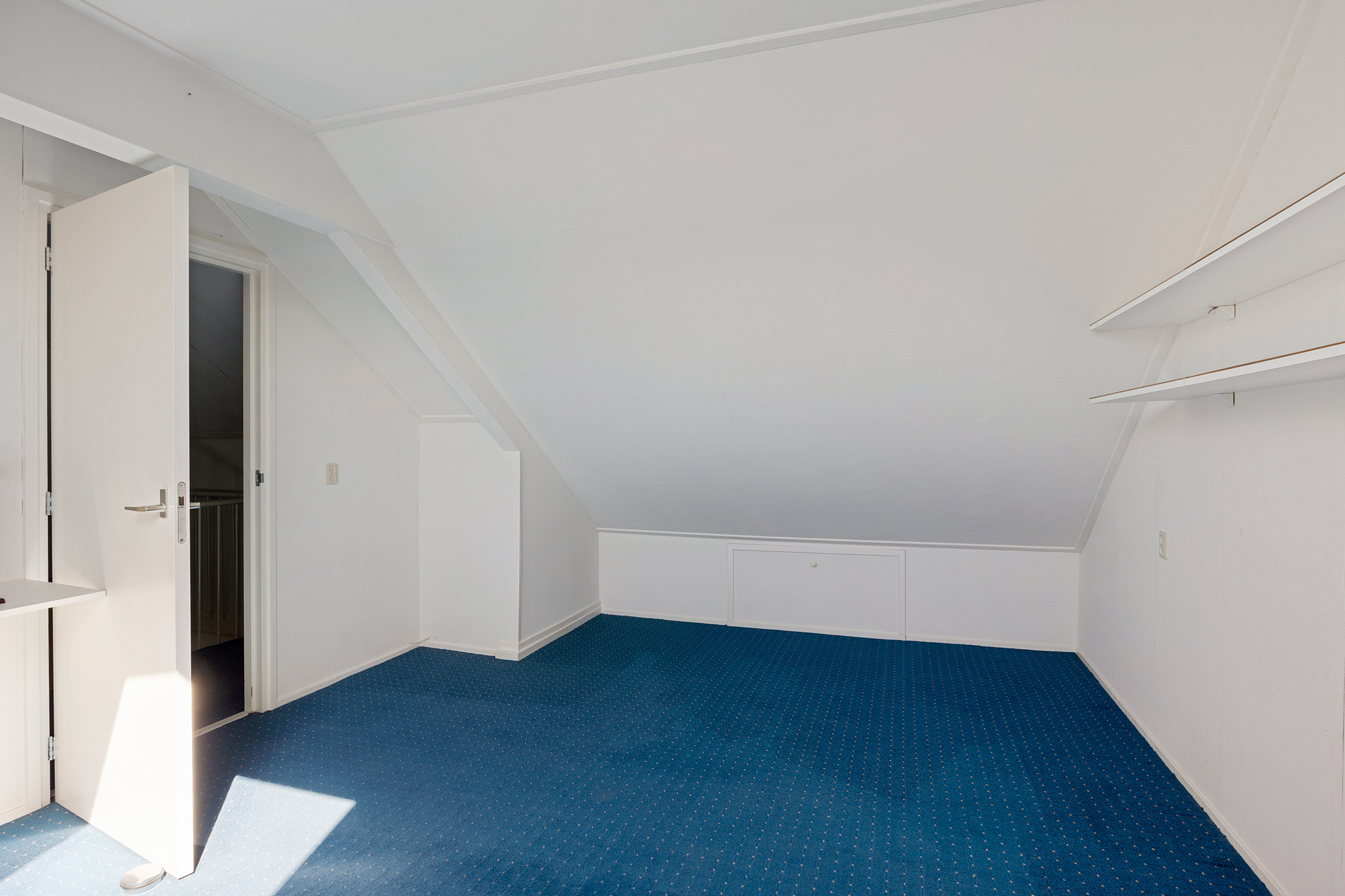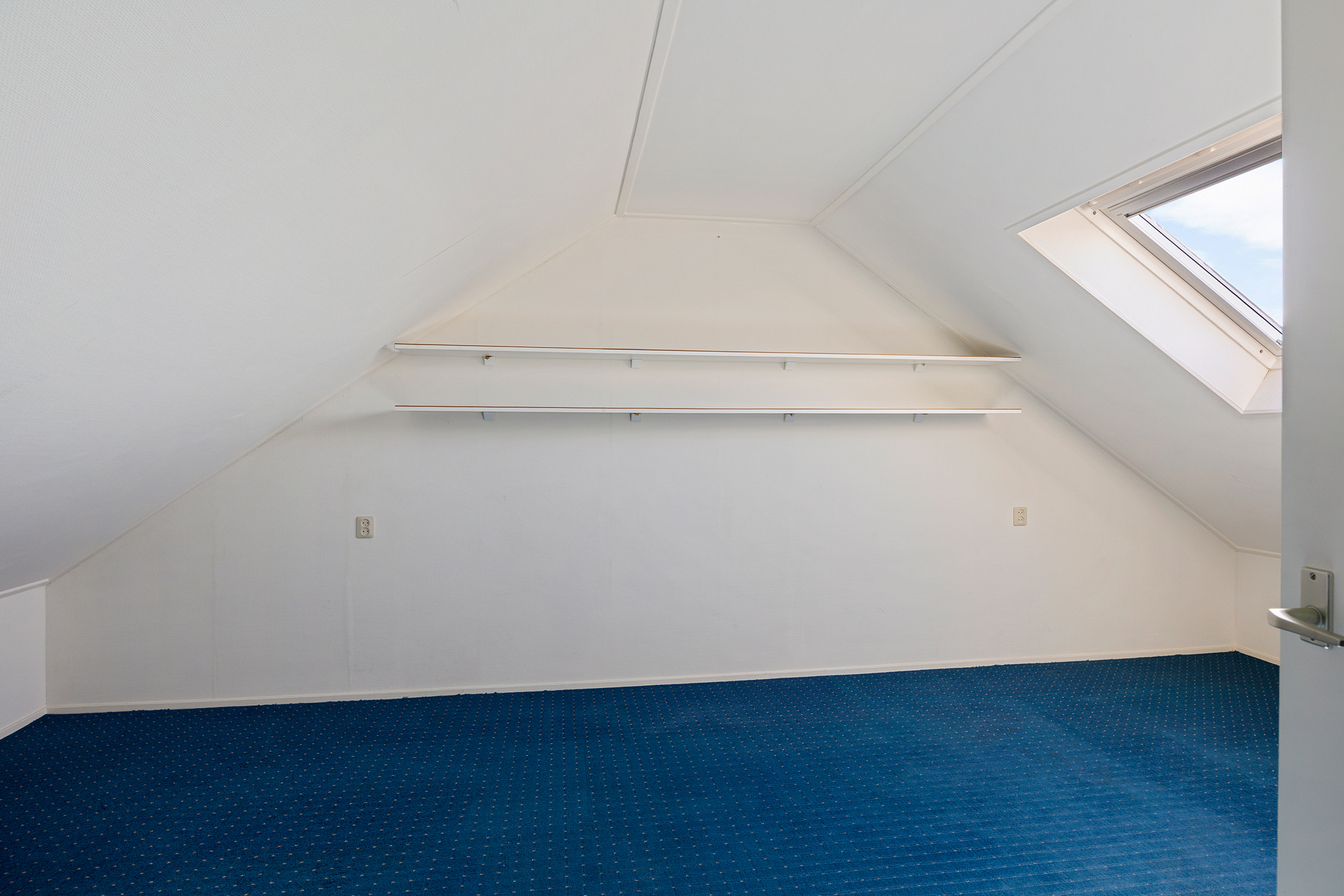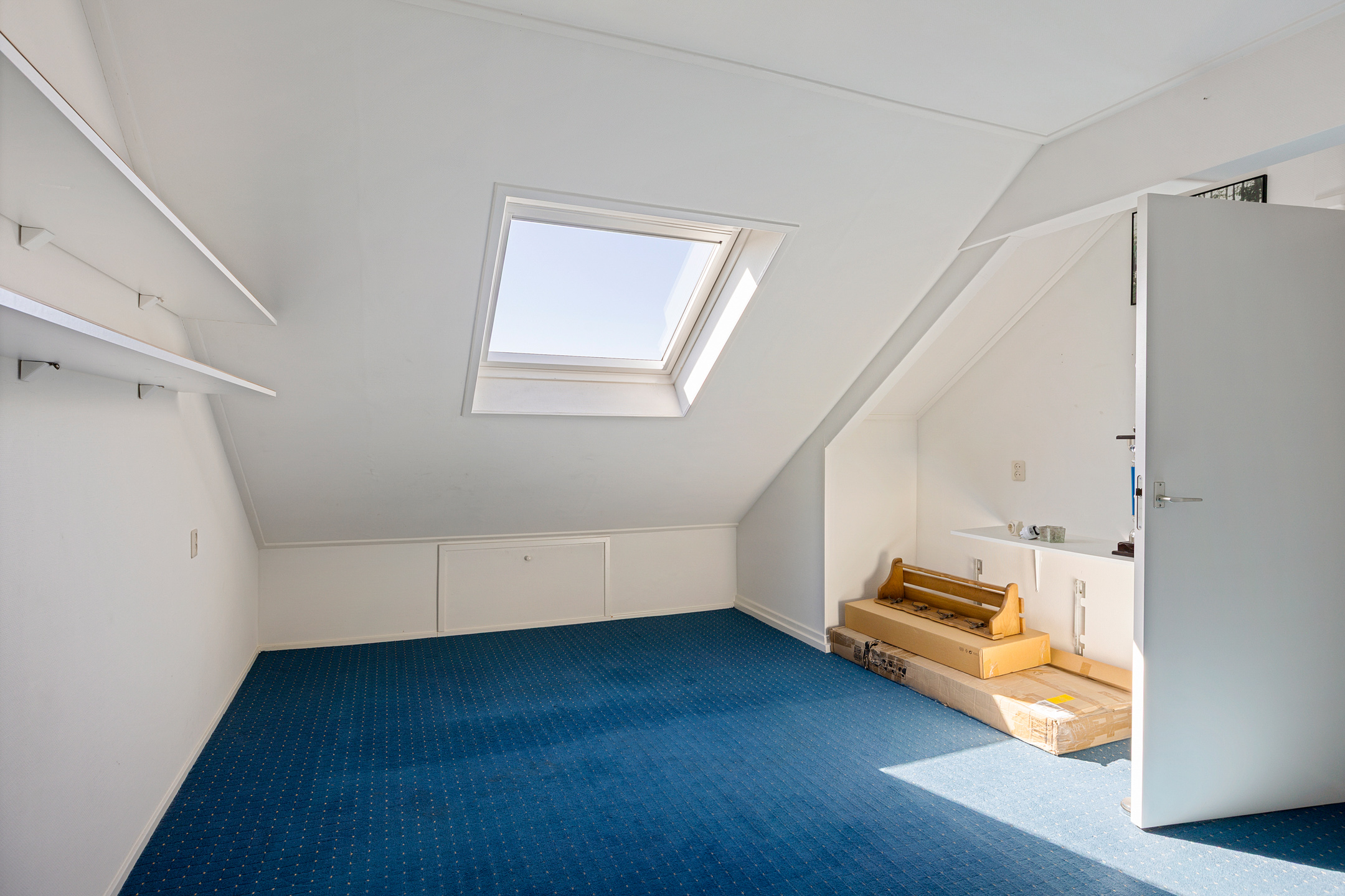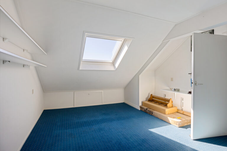 De tweede verdieping is bereikbaar via een vaste trap. Hier vind je een ruime vierde kamer met dakraam en knieschotten voor extra bergruimte. Dankzij de indeling en het daglicht is dit een prettige ruimte die zich goed leent als slaapkamer, werkruimte of hobbykamer. Op deze verdieping is ook de opstelplaats voor de technische installatie zoals de CV-ketel.