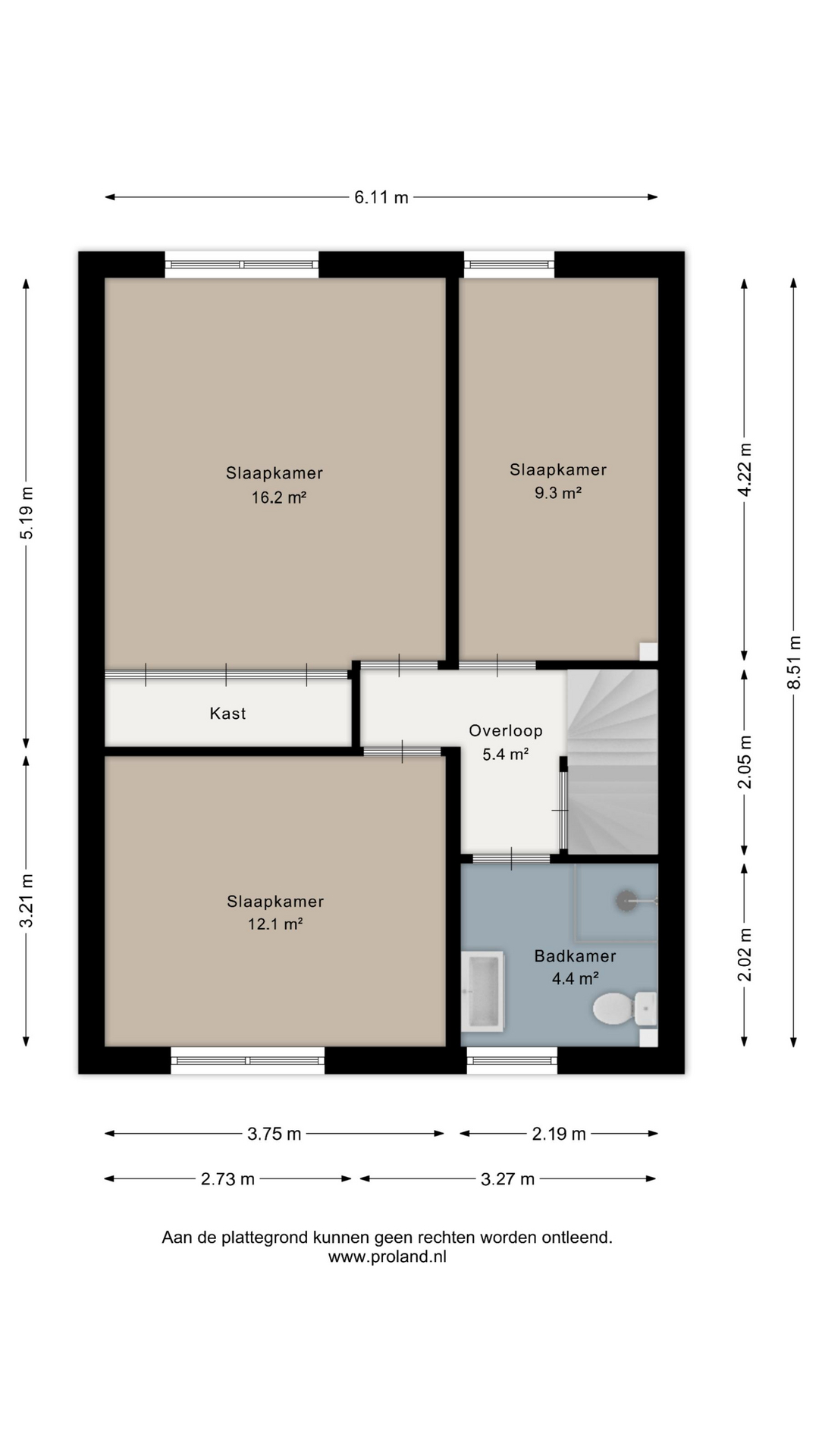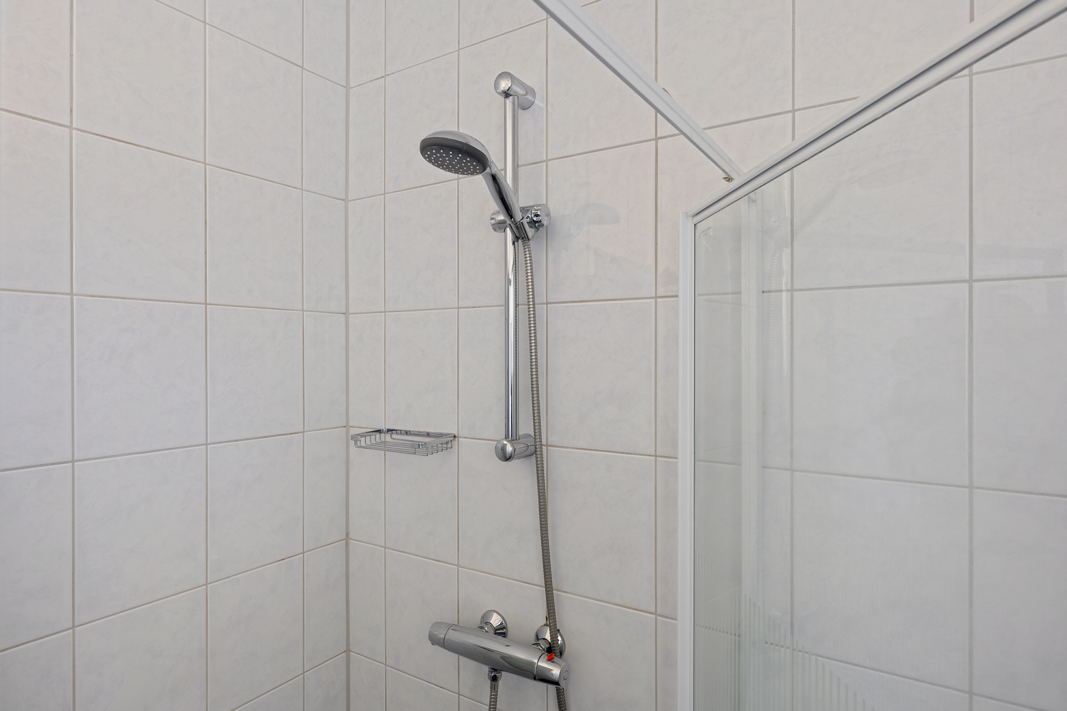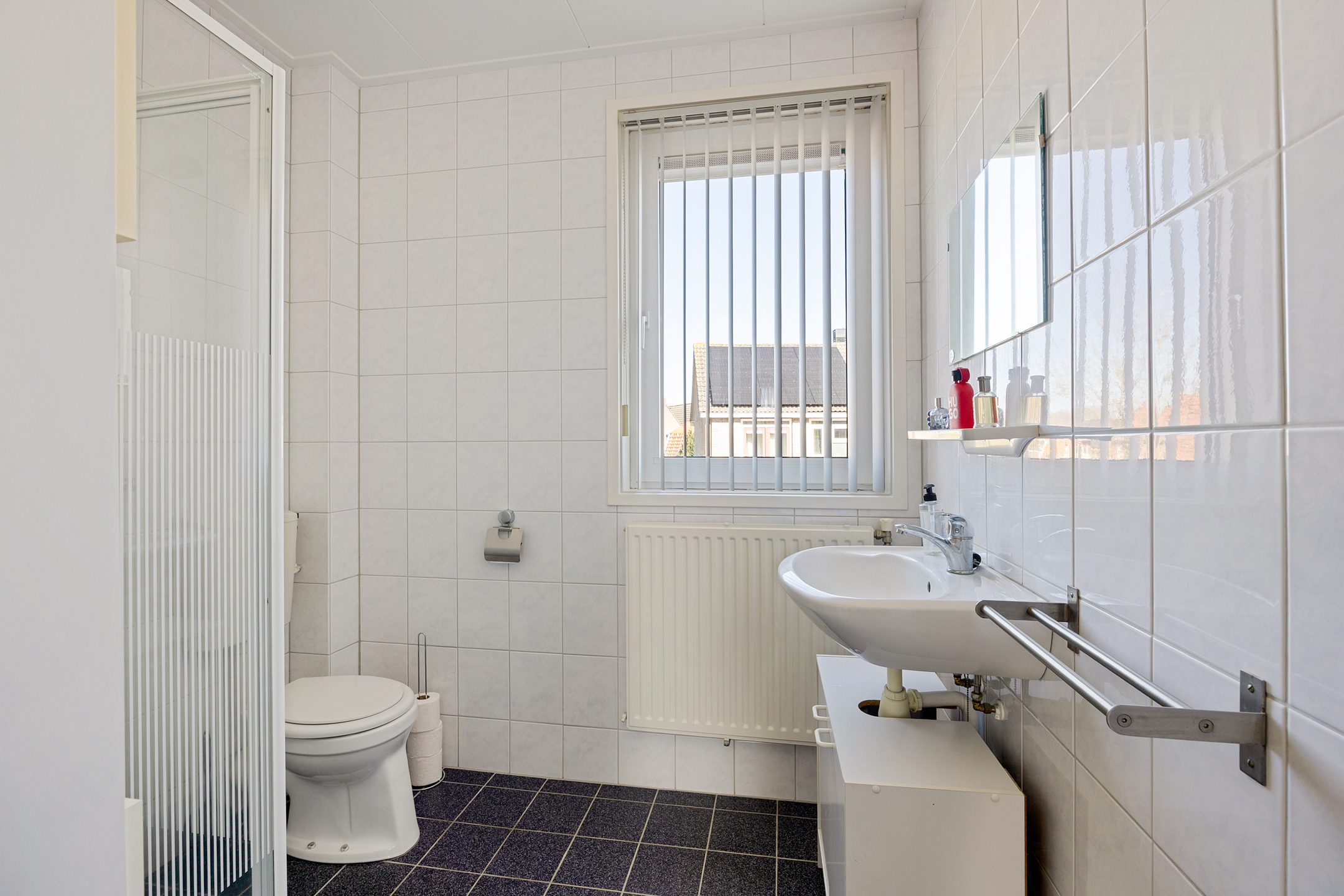 Op de eerste verdieping kom je via de overloop bij drie slaapkamers en de badkamer. De grootste slaapkamer ligt aan de achterzijde en biedt een fijn uitzicht richting het groen. De overige twee kamers zijn eveneens van goed formaat en geschikt als kinder-, werk- of logeerkamer. De badkamer is compact maar functioneel ingericht met een douche en wastafel.