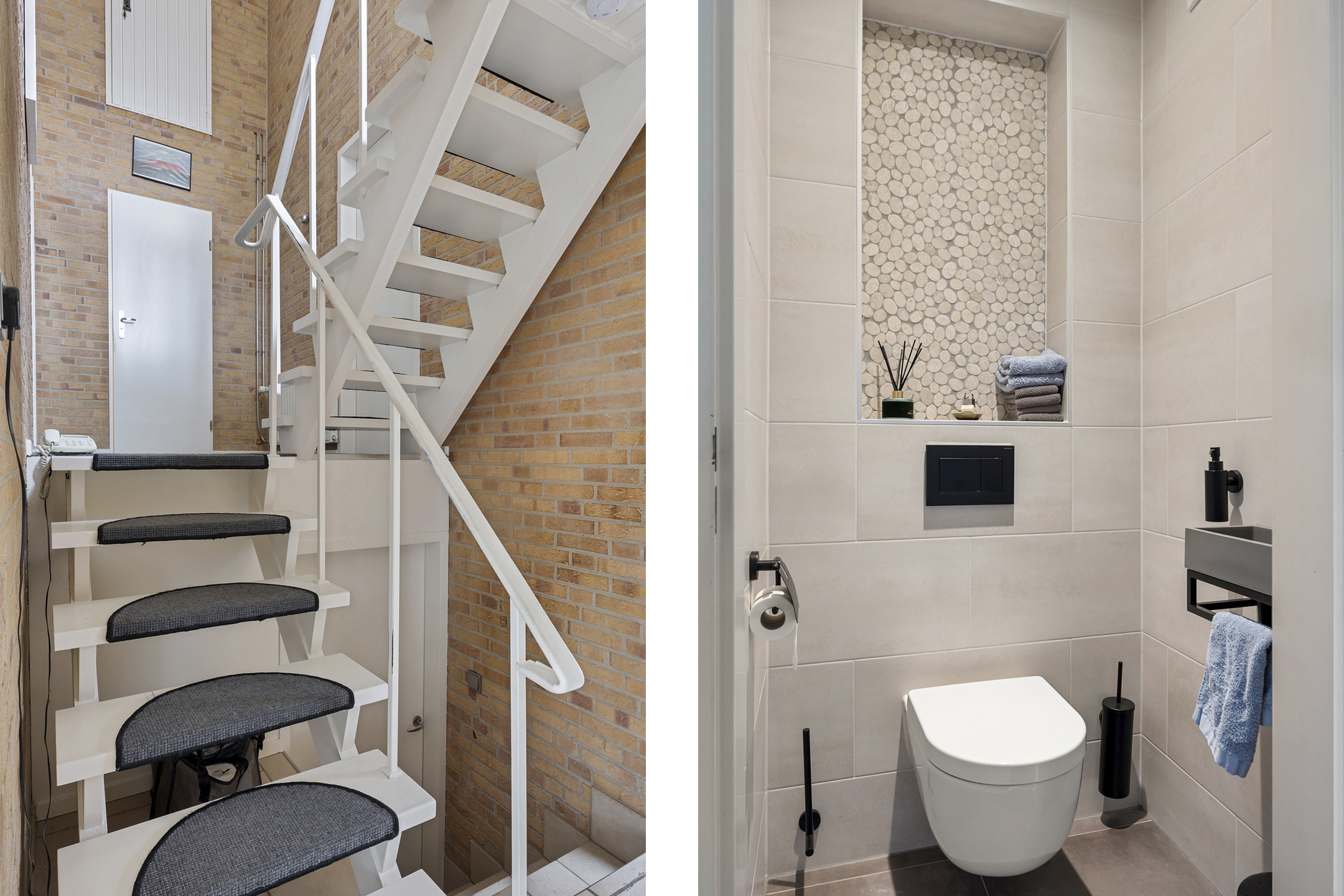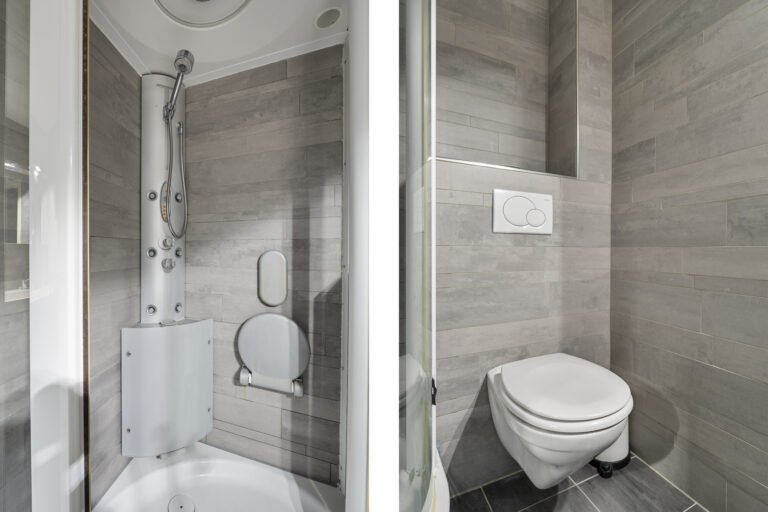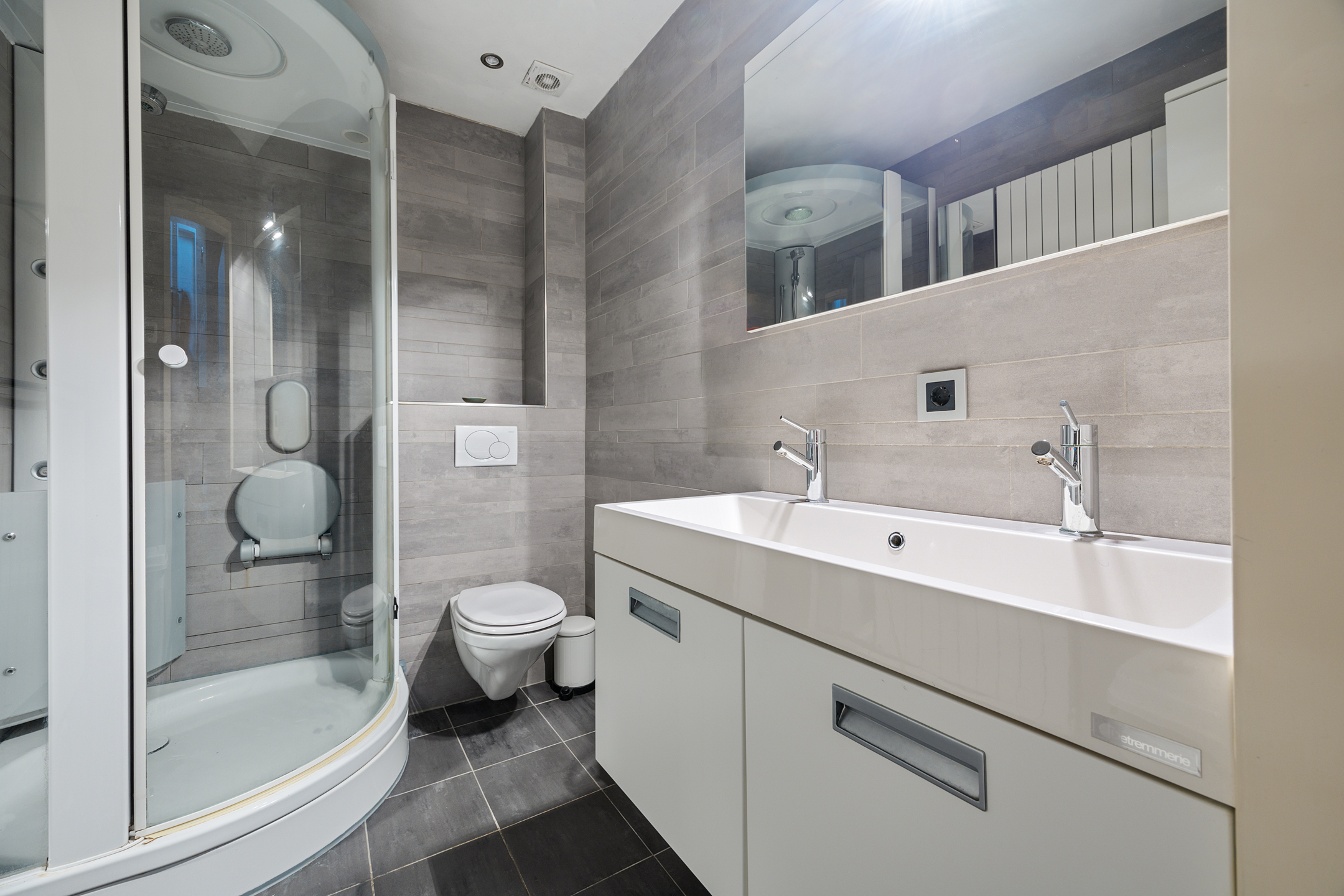 De badkamer is modern uitgevoerd en strak afgewerkt. Een verzorgde ruimte waar functionaliteit en comfort samenkomen, ideaal om de dag ontspannen te beginnen of juist rustig af te sluiten.