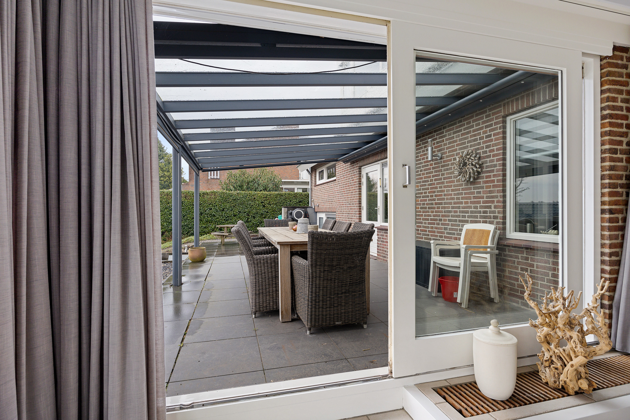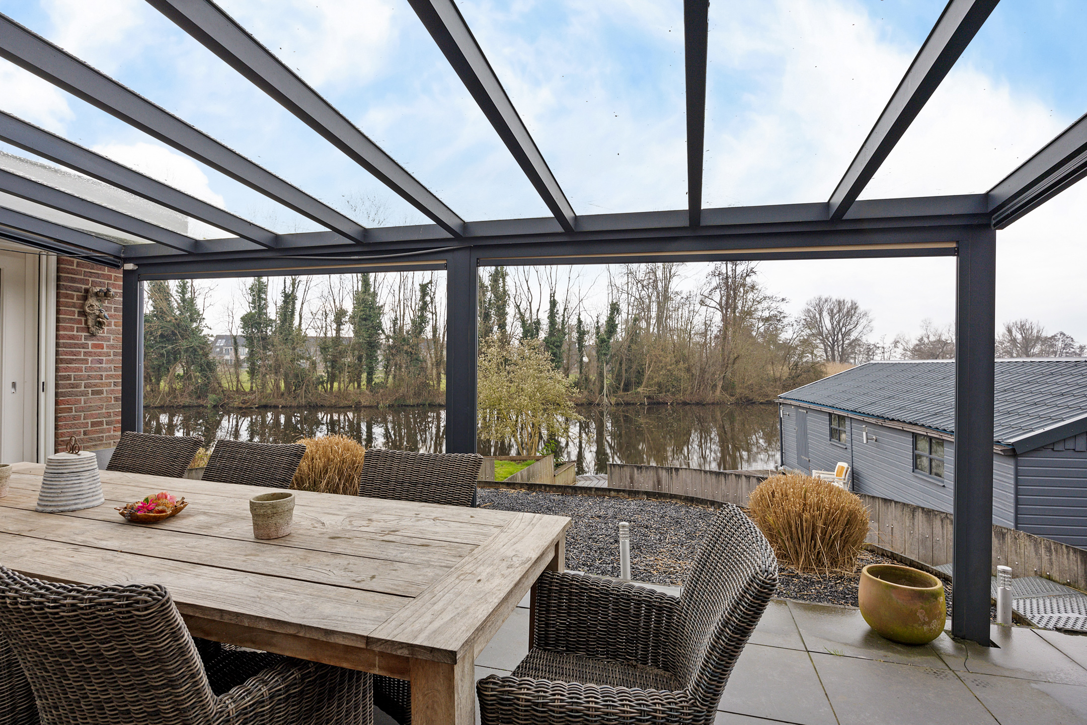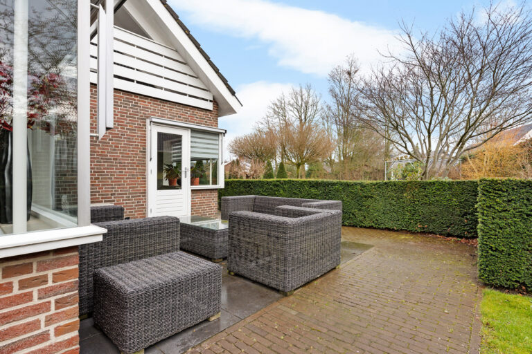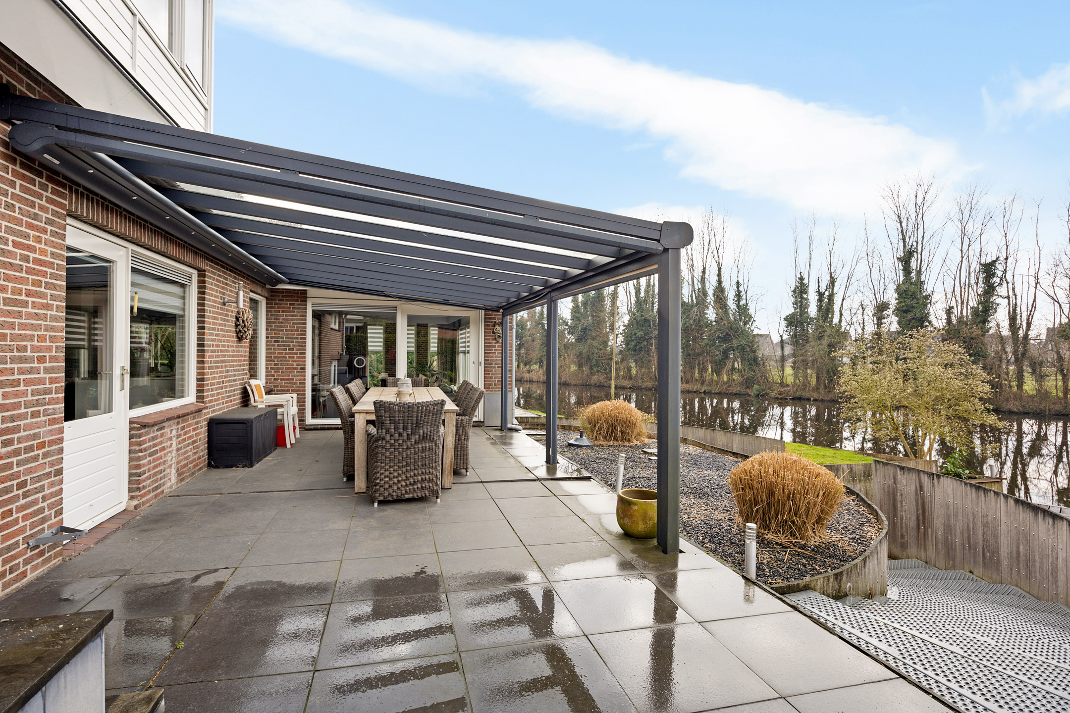 Vanuit de woonkamer stapt u direct onder de overkapping aan de achterzijde. Dit is een plek die het hele jaar door gebruikt wordt. In de zomer vormt het een verlengstuk van de woonkamer, waar u tot laat in de avond buiten zit. In de herfst en het voorjaar is het juist een beschutte plek waar u nog steeds kunt genieten van het buitenleven, met zicht op de tuin en het water. Het is precies zo’n plek waar het leven zich vanzelf naar buiten verplaatst.