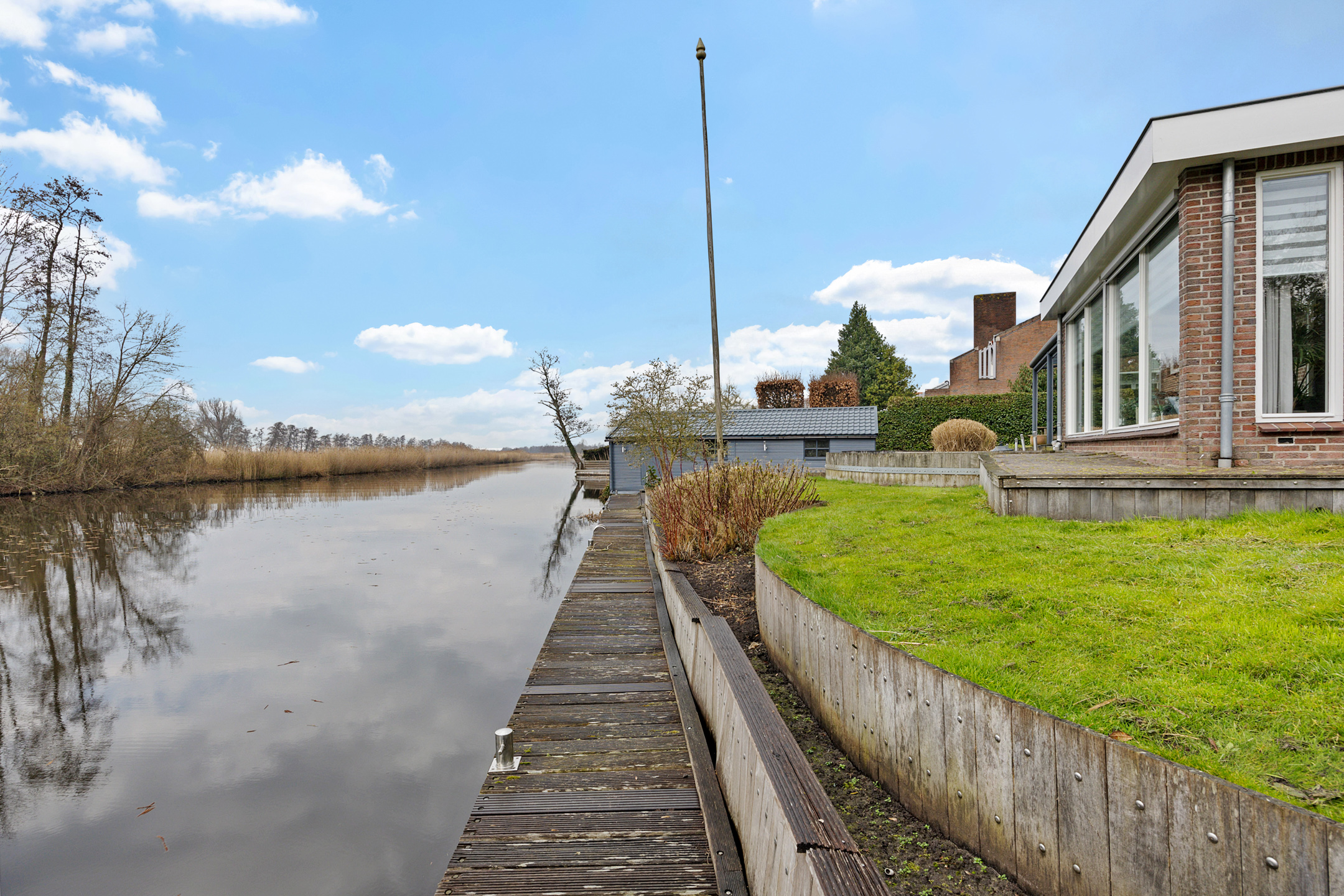 Het buitenleven speelt hier de hoofdrol. De tuin ligt direct aan open vaarwater en vormt een natuurlijke overgang tussen wonen en recreëren. In de ochtend begint de dag hier ontspannen, met een kop koffie aan het water, terwijl de wereld langzaam op gang komt. Gedurende de dag leeft u met het ritme van het water: een boot die rustig voorbijglijdt, het ruisen van rietkragen, de zon die schittert op het oppervlak. En wanneer de avond valt, verandert de tuin in een sfeervolle plek waar u onder de overkapping nog lang buiten kunt zitten, beschut en comfortabel, met uitzicht over het water dat langzaam tot rust komt.