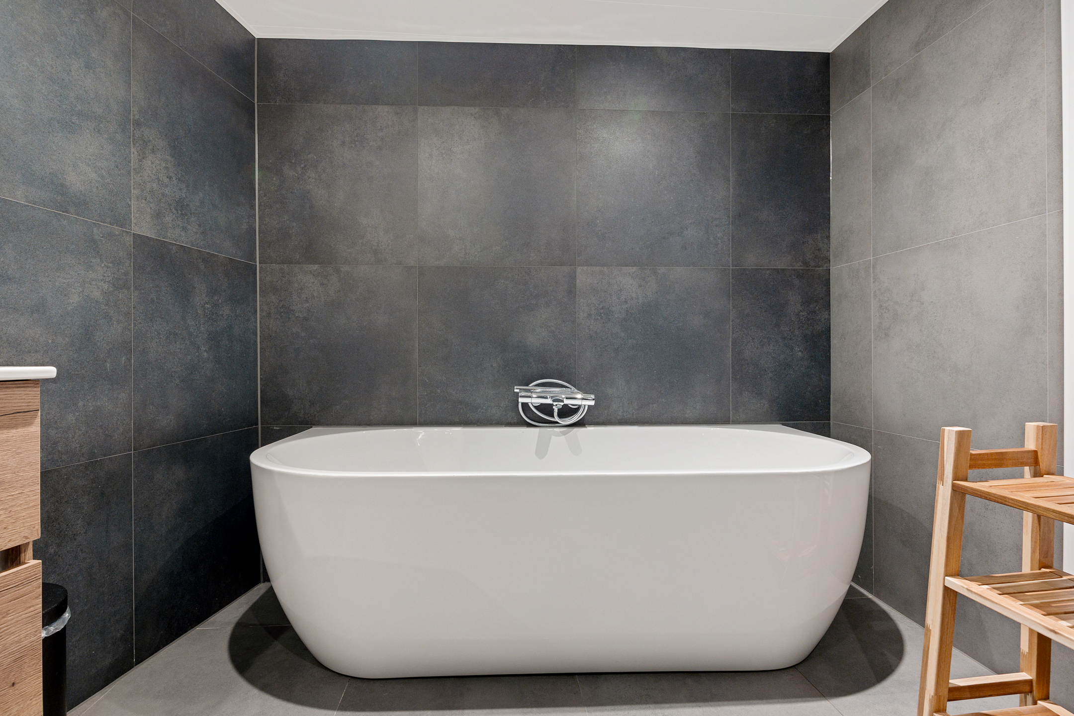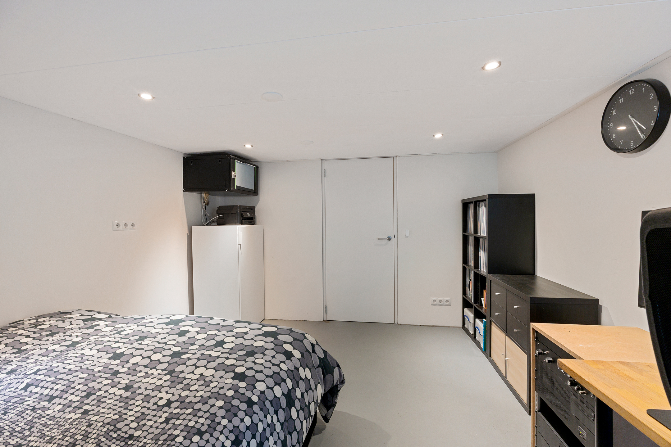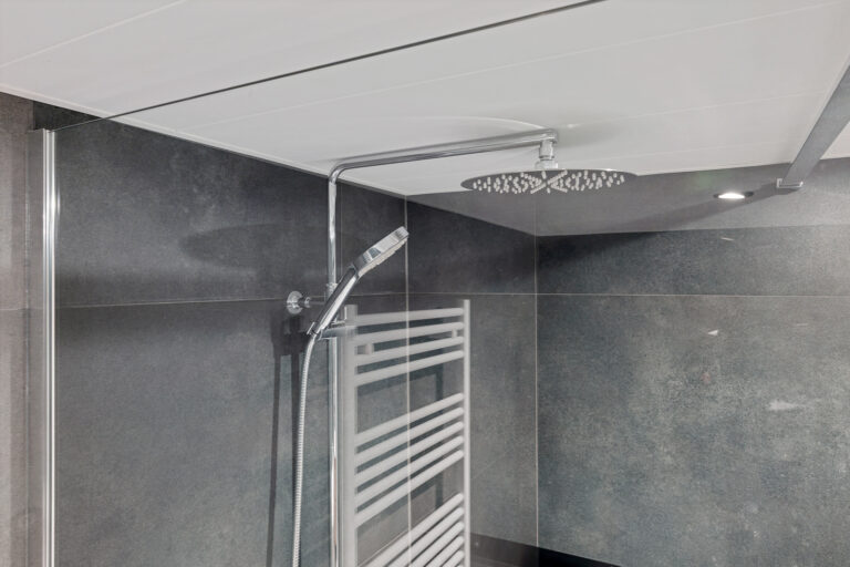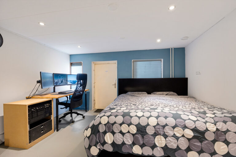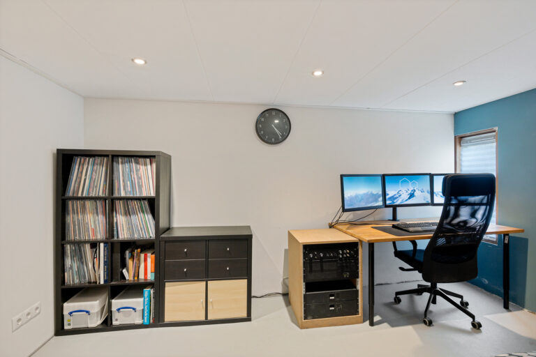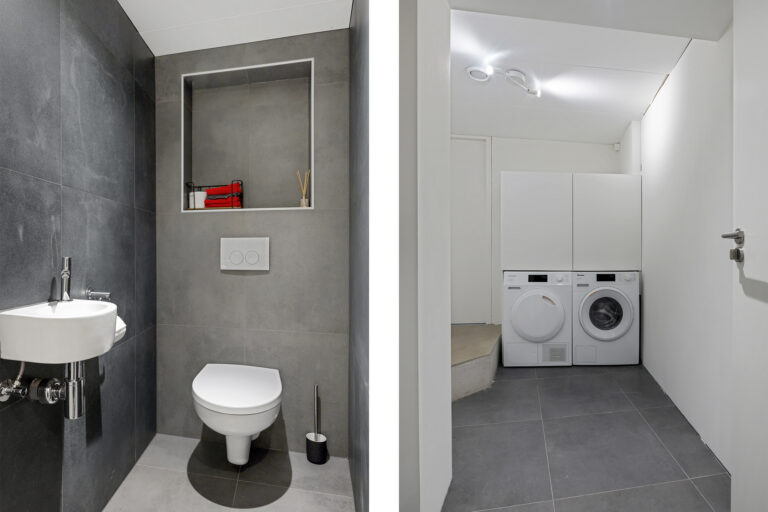 Via de trap in de woonkamer bereik je de benedenverdieping. Hier kom je in een ruime hal en merk je direct het comfort van de vloerverwarming die over de gehele verdieping is aangelegd. Op deze verdieping bevinden zich de opstelling voor de wasmachine, een separaat toilet en een badkamer aan de voorzijde met ligbad, inloopdouche en een wastafel. Aan de achterzijde ligt een praktische slaap- of hobbykamer. Aansluitend vind je de aangebouwde berging met betonvloer, elektra en dubbele deuren naar de tuin.