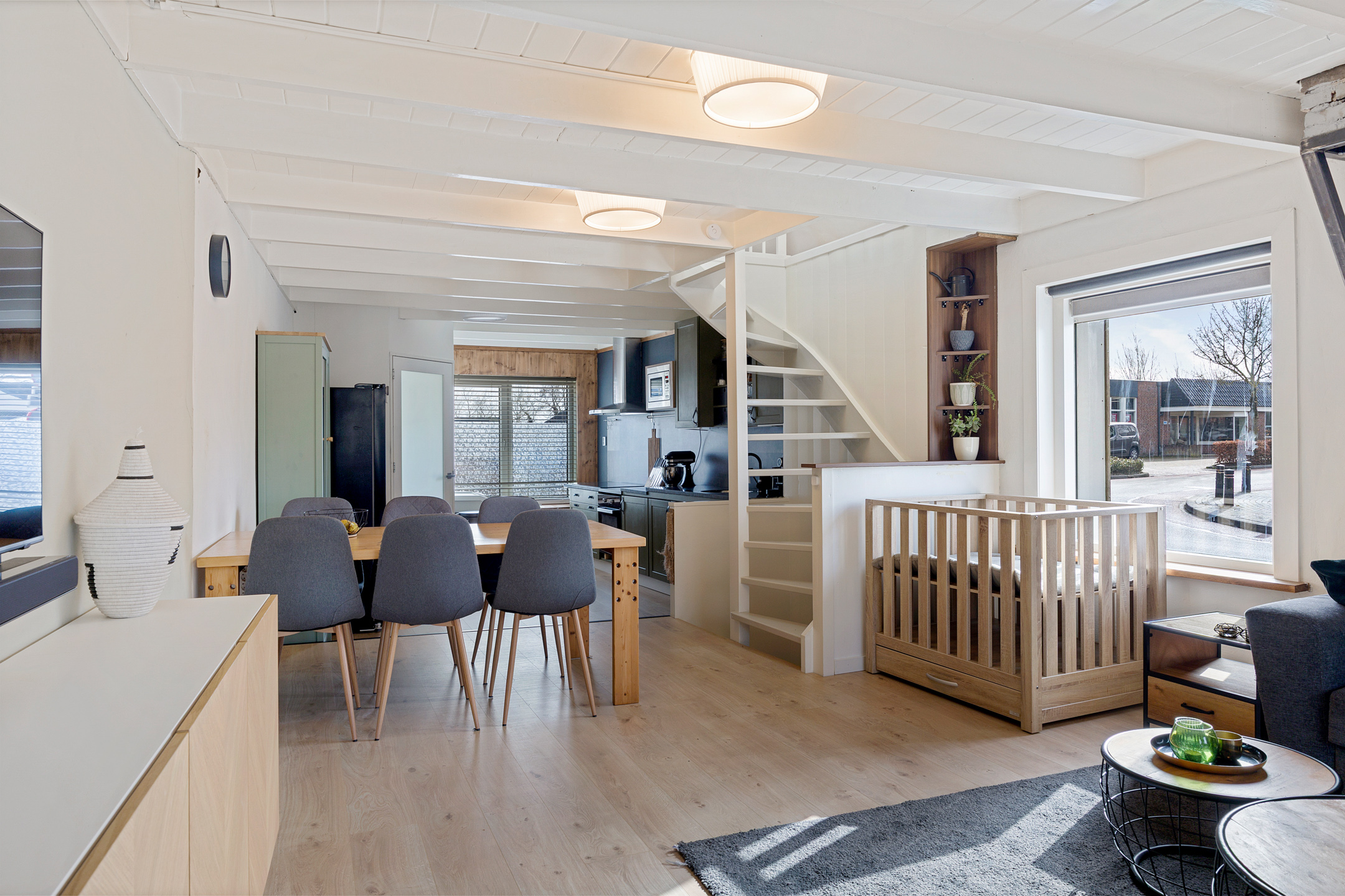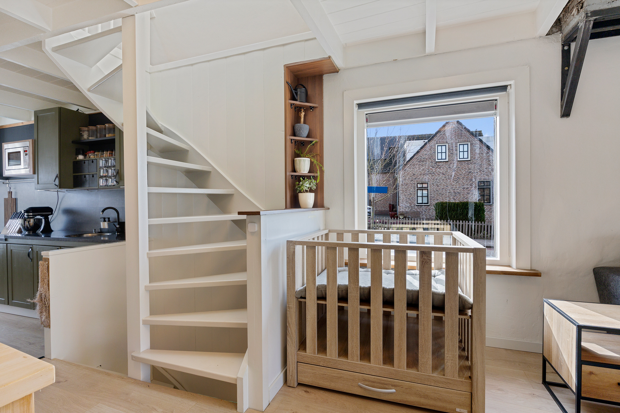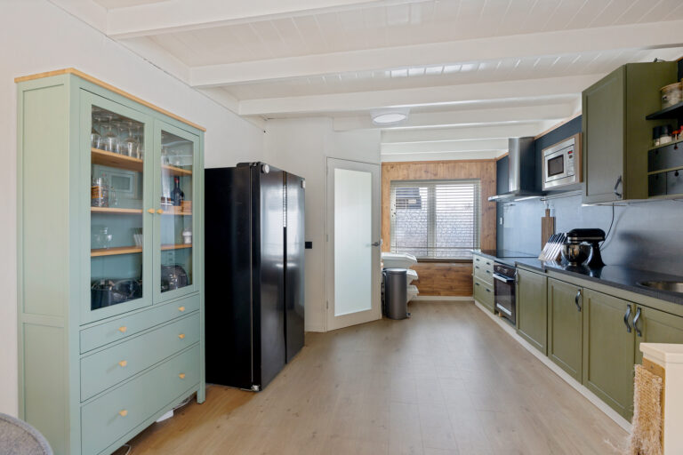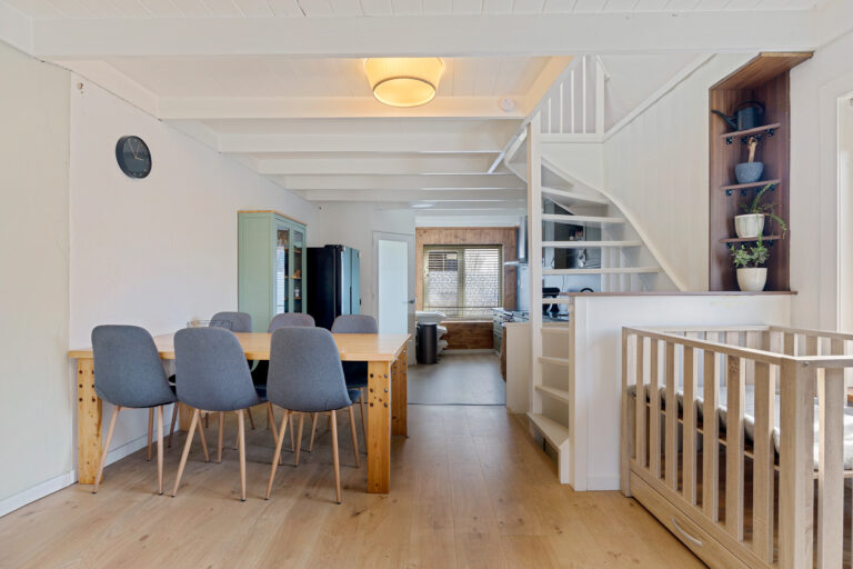 Je komt binnen op de gezellige woonverdieping. Aan de voorzijde bevindt zich de open keuken en aan de achterzijde de sfeervolle woonkamer. Het balkenplafond en de ramen aan de voor-, zij- en achterzijde zorgen voor een warme uitstraling en veel natuurlijk licht. Vanuit de woonkamer heb je toegang tot het dakterras aan de achterzijde.