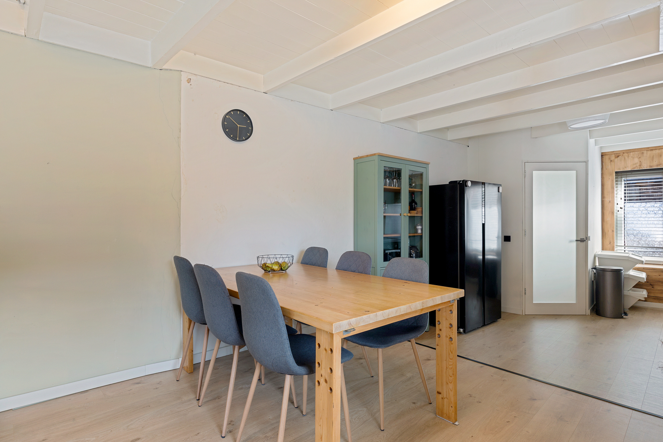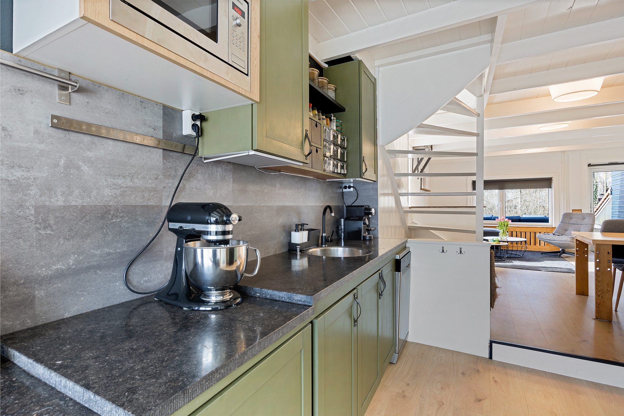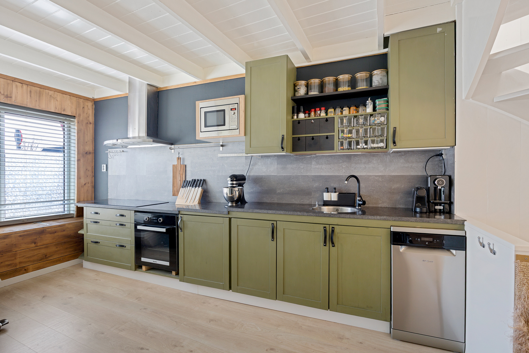 Je komt binnen op de gezellige woonverdieping. Aan de voorzijde bevindt zich de open keuken en aan de achterzijde de sfeervolle woonkamer. Het balkenplafond en de ramen aan de voor-, zij- en achterzijde zorgen voor een warme uitstraling en veel natuurlijk licht. Vanuit de woonkamer heb je toegang tot het dakterras aan de achterzijde.