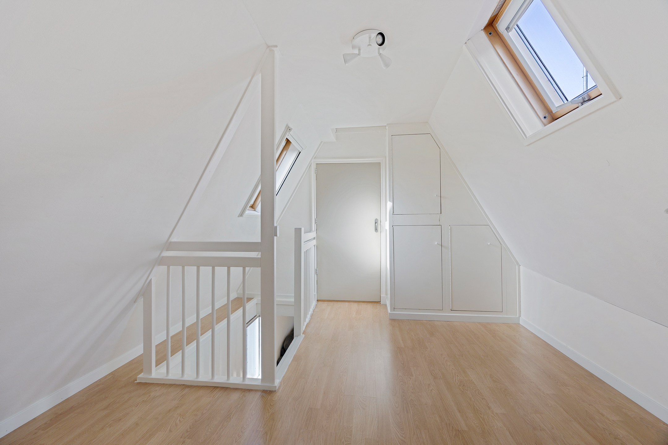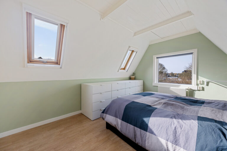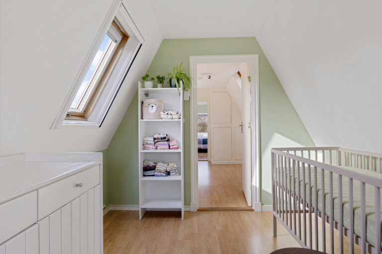 De eerste verdieping bereik je eveneens via de trap in de woonkamer. Hier kom je op een ruime overloop met dakraam en een vaste kast met de opstelplaats voor de cv-ketel. Op deze verdieping bevinden zich twee slaapkamers, één aan de voorzijde en één aan de achterzijde van de woning.