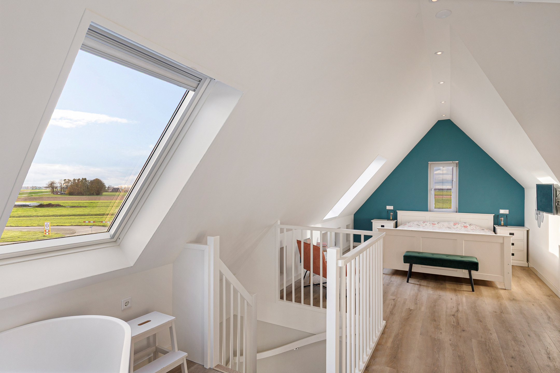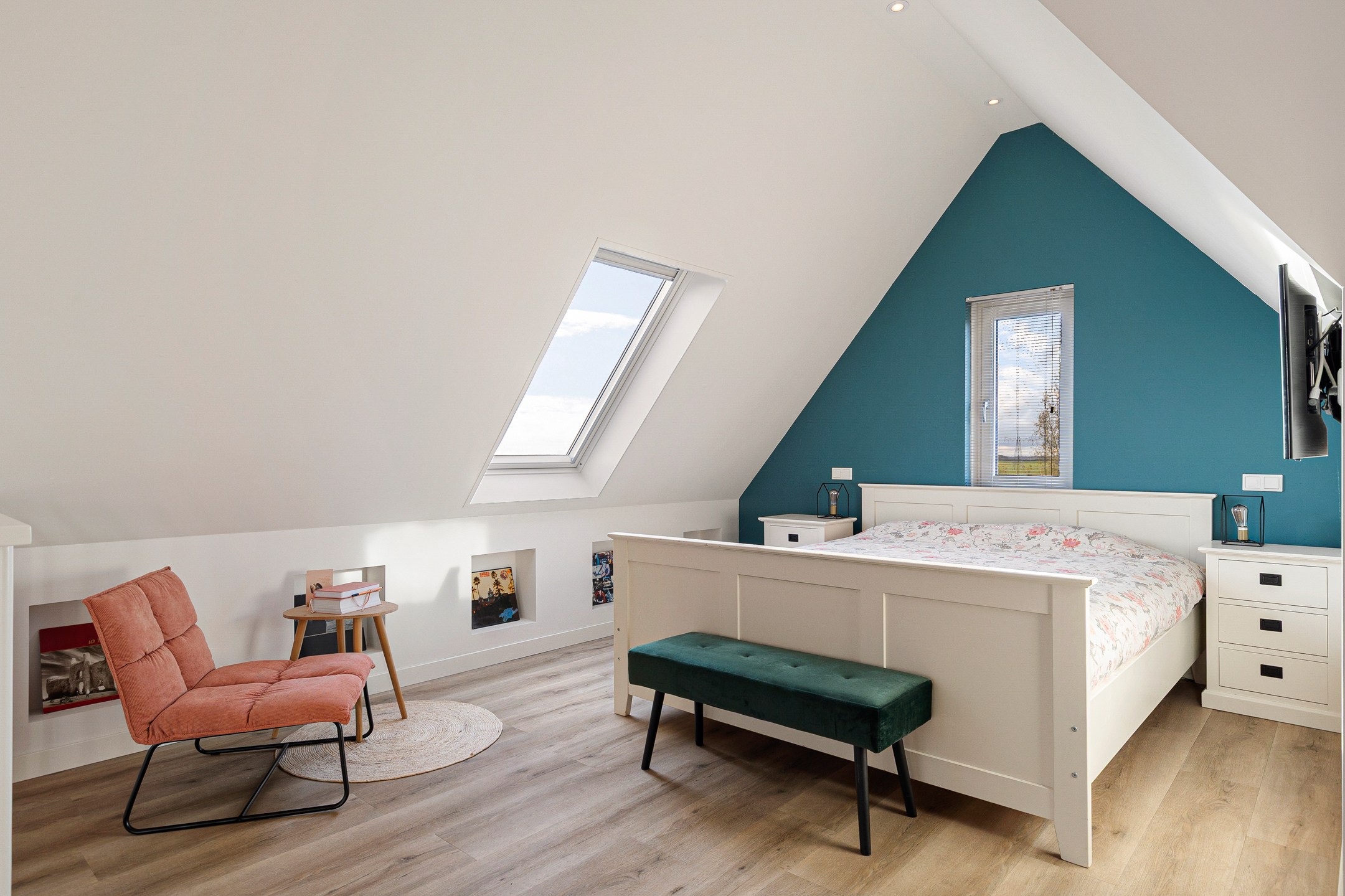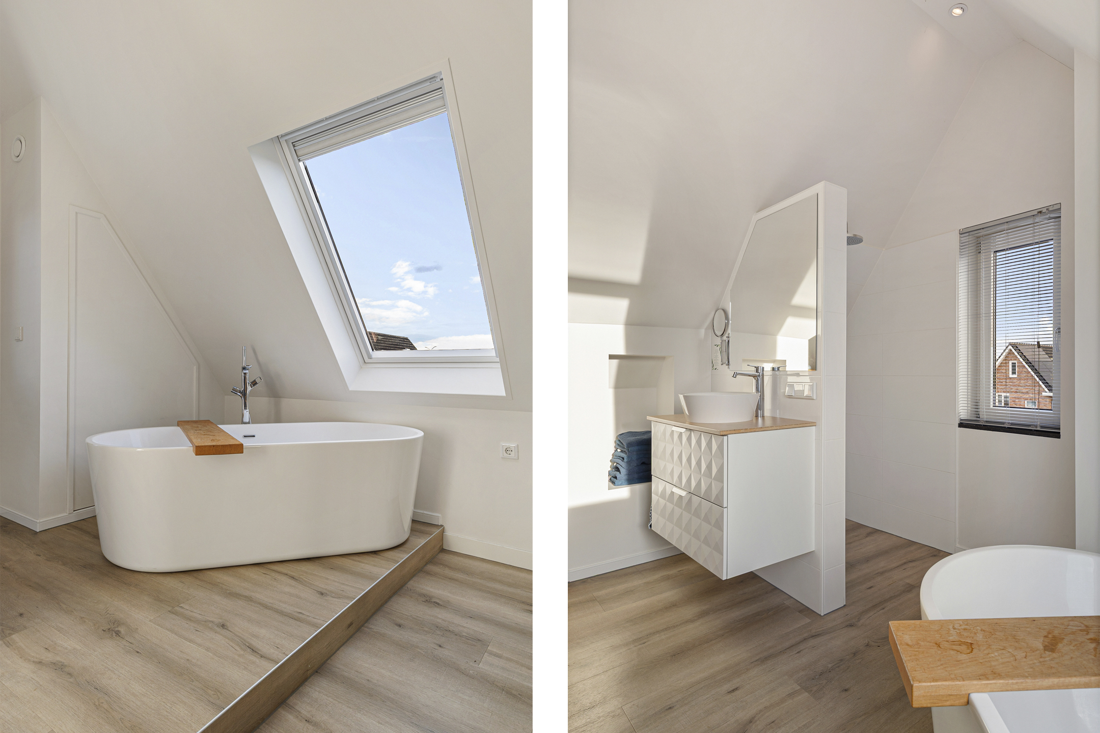 Met een vaste trap bereik je de tweede verdieping. Deze verdieping is verrassend ruim en volledig afwerkt als extra slaapverdieping. Hier vind je een fijne slaapkamer met inbouwkast, tuimelramen en een tweede, complete badkamer met bad, douche, wastafel en vloerverwarming in het badkamergedeelte. Een ideale verdieping voor een oudere thuiswonende zoon of dochter, logees, of als luxe oudersuite.