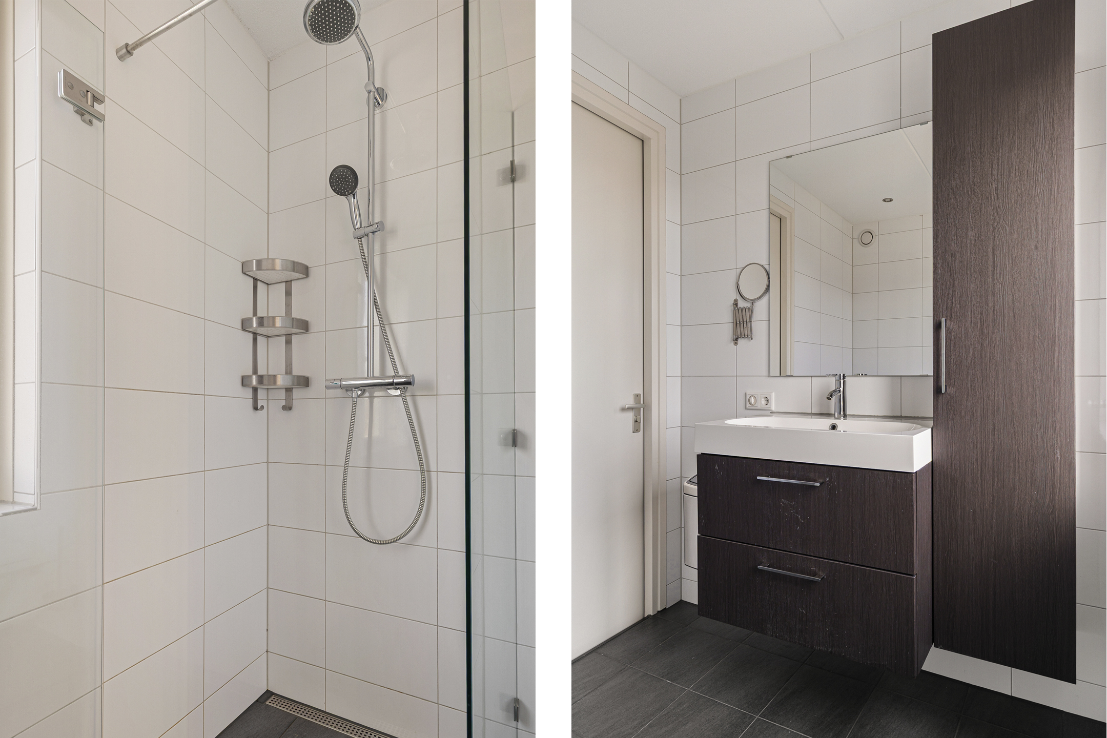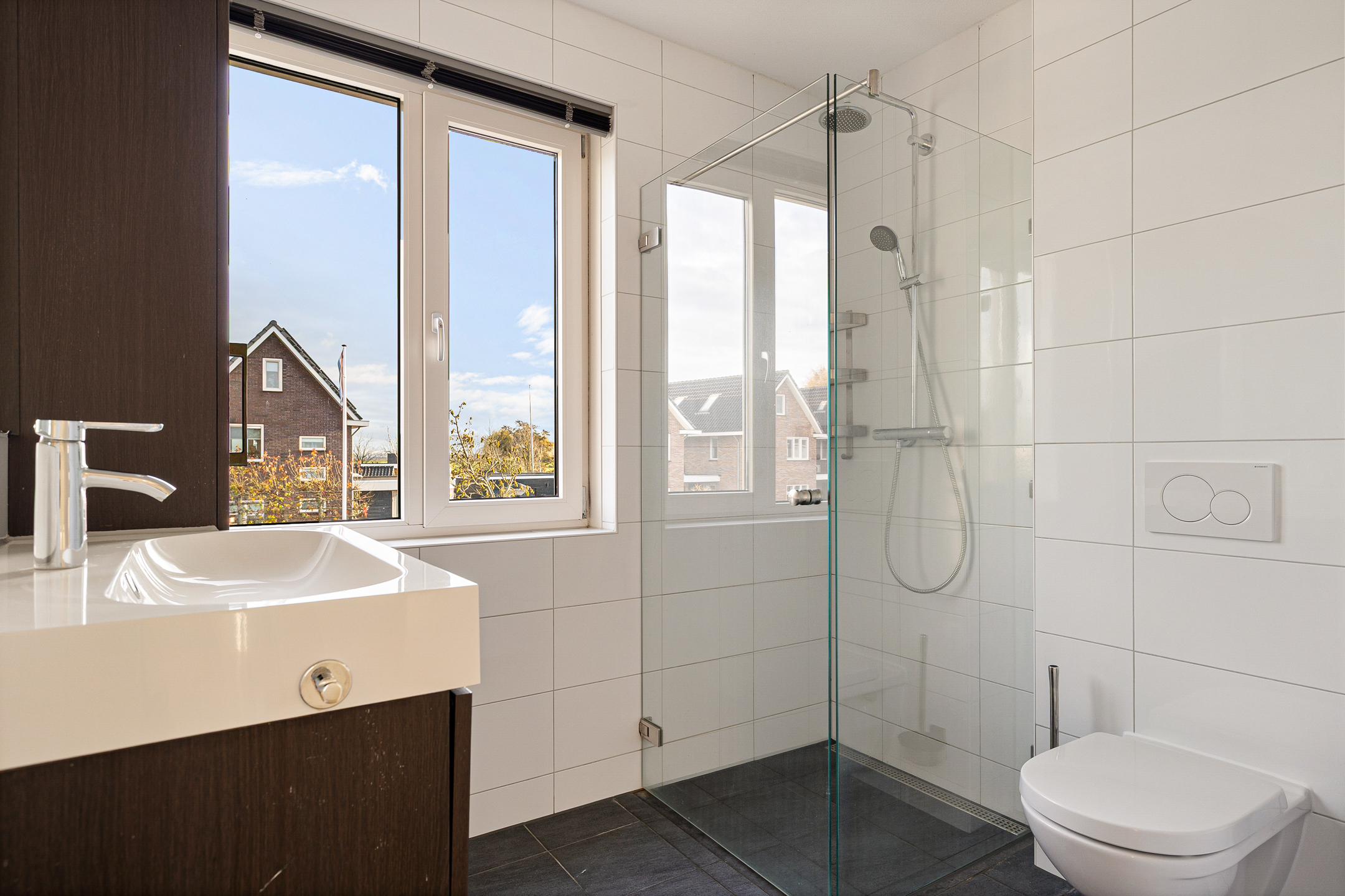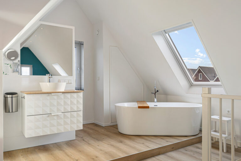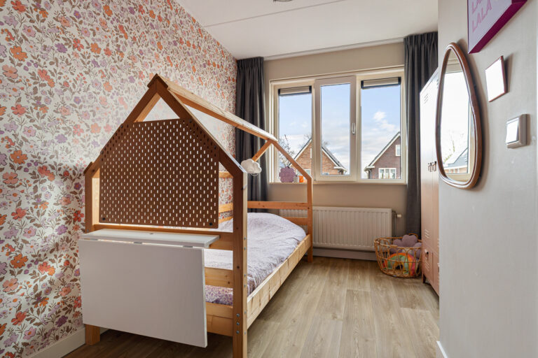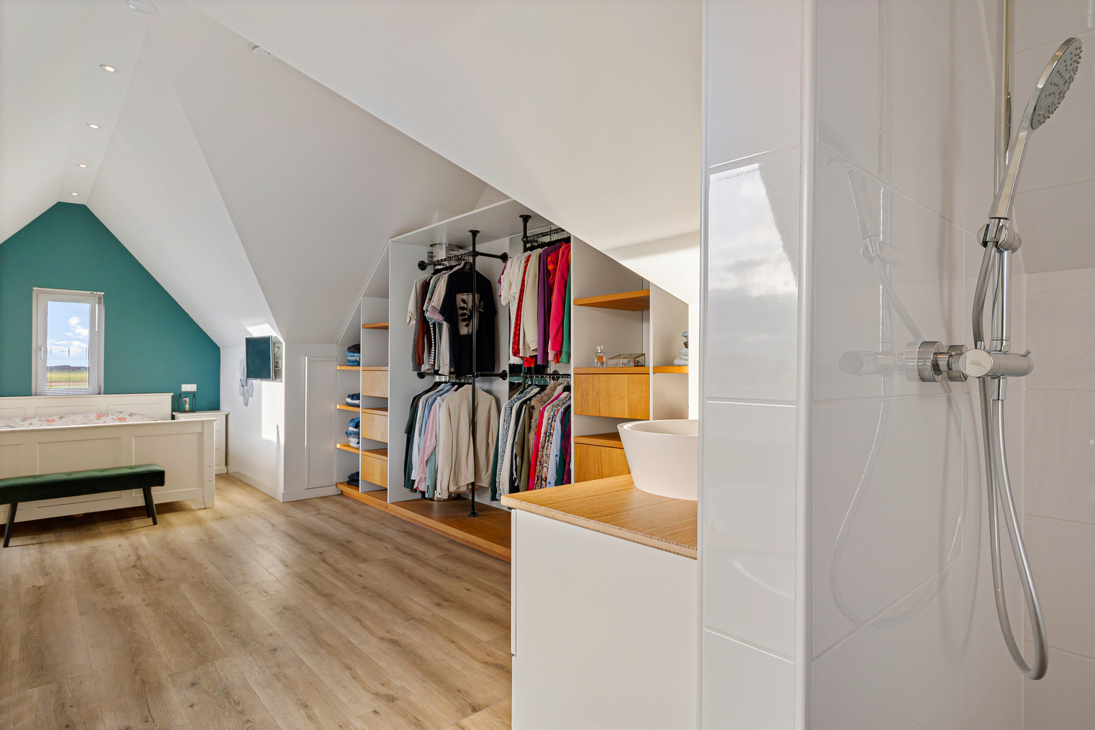 Met een vaste trap bereik je de tweede verdieping. Deze verdieping is verrassend ruim en volledig afwerkt als extra slaapverdieping. Hier vind je een fijne slaapkamer met inbouwkast, tuimelramen en een tweede, complete badkamer met bad, douche, wastafel en vloerverwarming in het badkamergedeelte. Een ideale verdieping voor een oudere thuiswonende zoon of dochter, logees, of als luxe oudersuite.