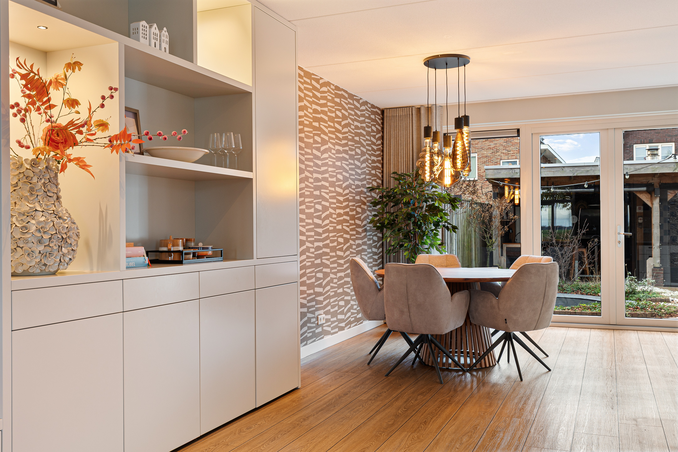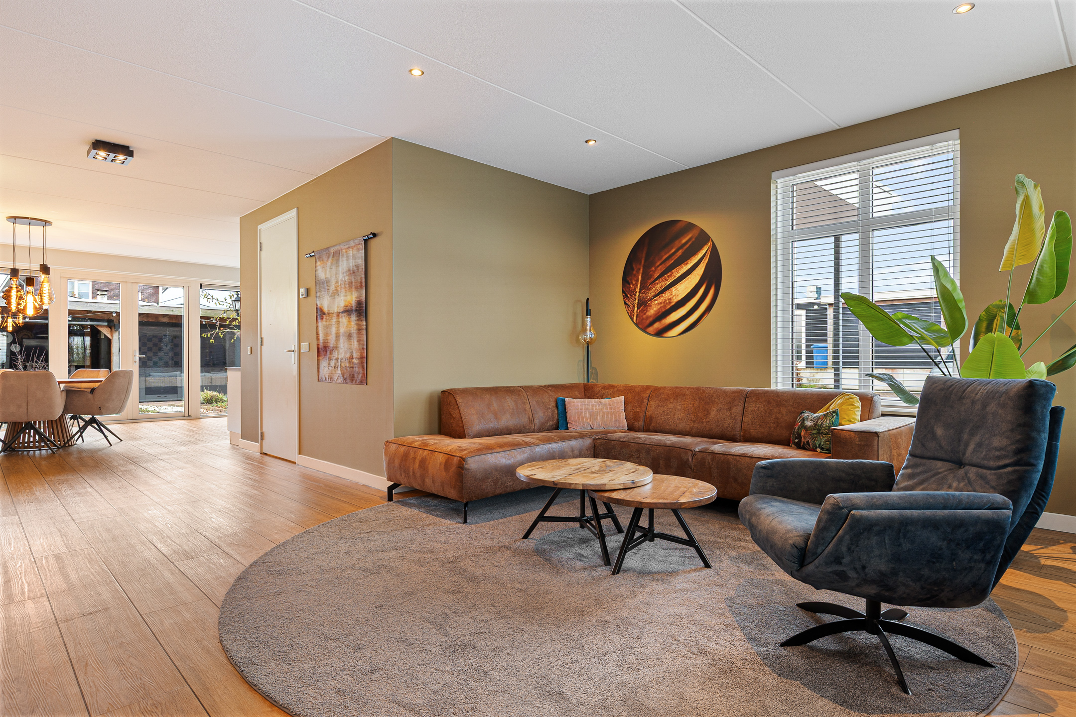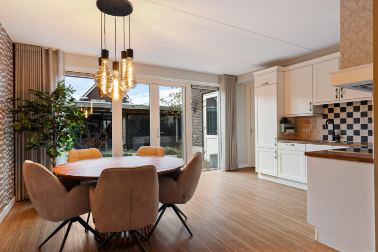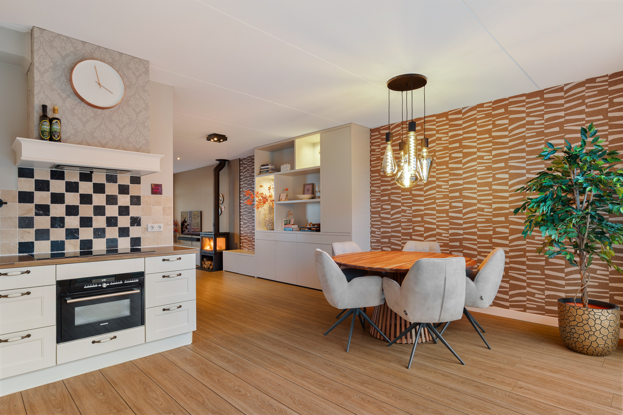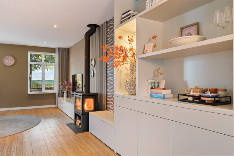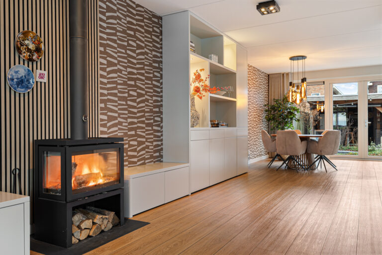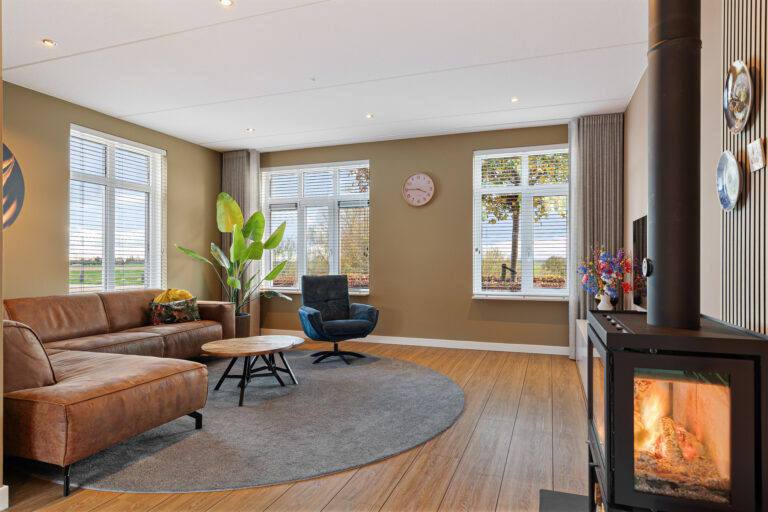 Bij binnenkomst ervaar je meteen de lichte en royale woonkamer, waar pvc-vloeren met vloerverwarming zorgen voor optimaal wooncomfort. De sfeervolle houtkachel en de grote raampartijen geven de ruimte een warme en uitnodigende uitstraling. Dankzij de kunststof tuindeuren aan de achterzijde geniet je van veel natuurlijke lichtinval en een prettige verbinding met de tuin.