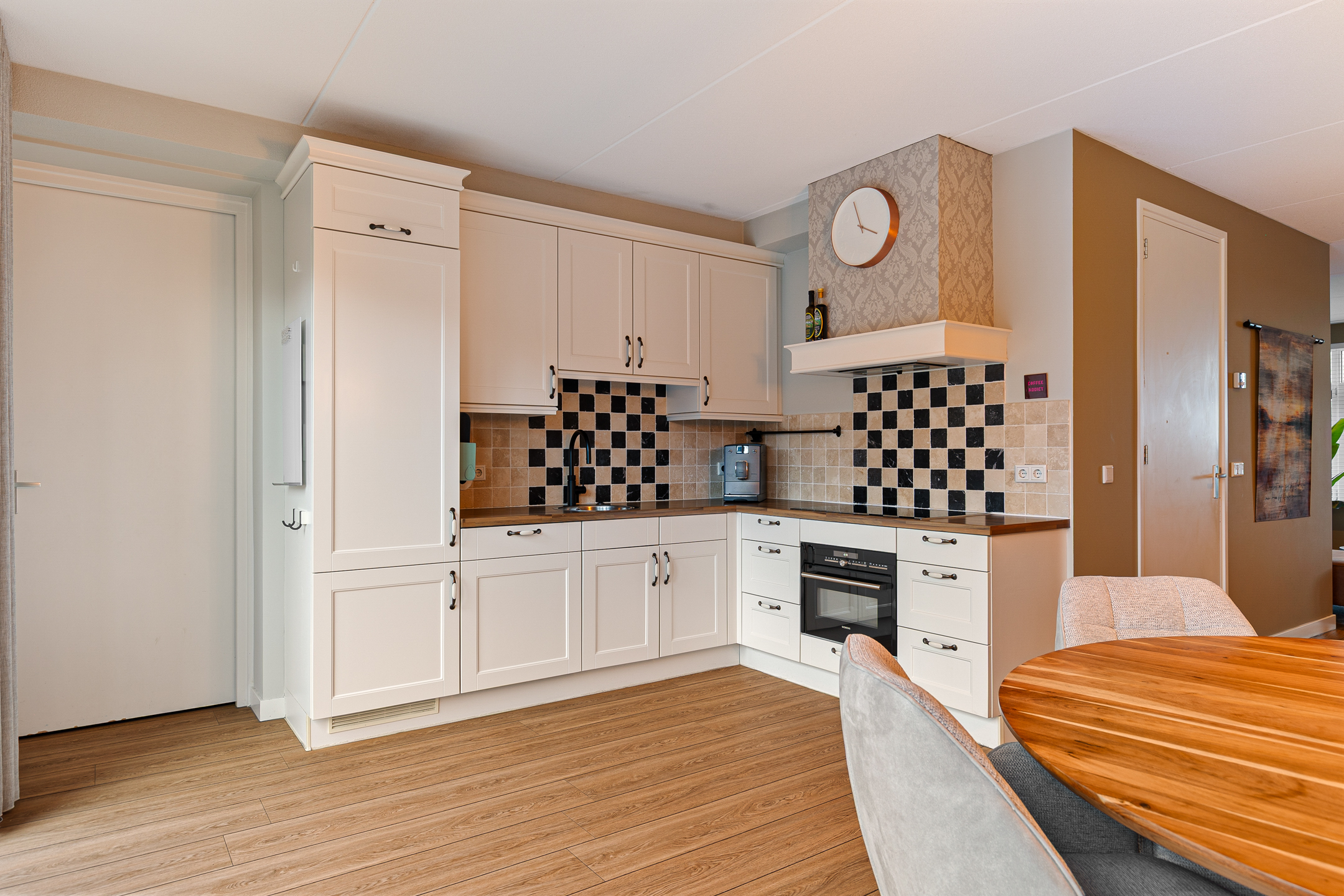 De keukenruimte is eveneens uitgerust met een pvc-vloer en vloerverwarming. De keuken (in hoekopstelling) beschikt over diverse moderne inbouwapparatuur die door de jaren heen is vernieuwd. Denk hierbij aan een inductiekookplaat, een zeer ruime koelkast, een Quooker en een oven. Vanuit de keuken heb je direct toegang tot de grote, volledig geïsoleerde bijkeuken. Deze veelzijdige ruimte is ideaal voor extra opslag, hobby’s of een werkplek, en is voorzien van een wasmachine- en drogeraansluiting en een praktische uitstortgootsteen.