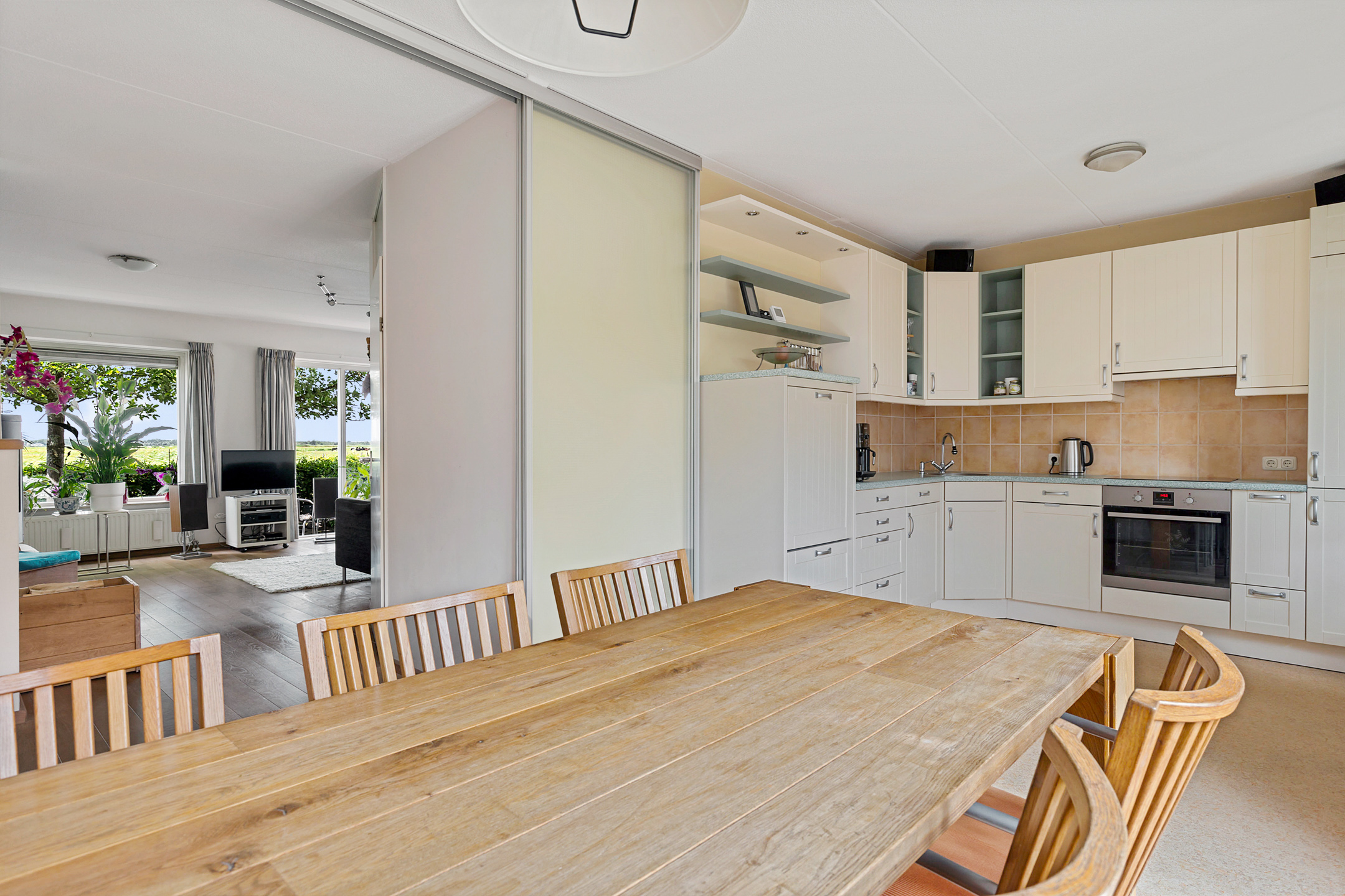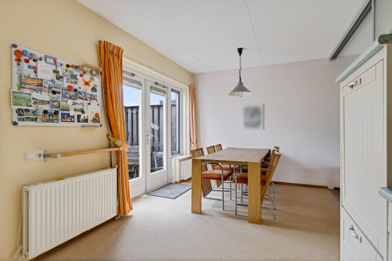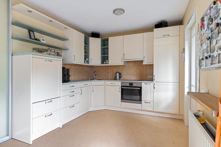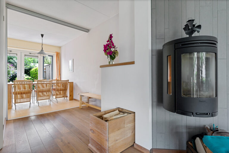 De royale L-vormige living is een sfeervolle plek waar je direct een gevoel van thuis ervaart. De massieve eiken vloer en houtkachel zorgen voor warmte en karakter. De open eetkeuken – voorzien van inbouwapparatuur (vaatwasser, inductie kookplaat, oven en koel/vries-combinatie) in een hoekopstelling – grenst via dubbele tuindeuren aan de achtertuin. Handig detail: de keuken is met een schuifwand af te sluiten van de woonkamer. Aansluitend vind je de bijkeuken, met de aansluiting voor de wasmachine. Vanuit hier bereik je binnendoor de garage. Deze garage is opgesplitst in een berging en een lichte (werk)ruimte dankzij de aanwezige ramen en deur.