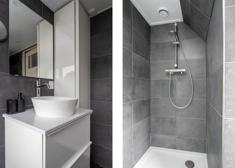 Overloop met toegang tot drie slaapkamers en de moderne badkamer, voorzien van een douchehoek, hangend toilet en wastafelmeubel.