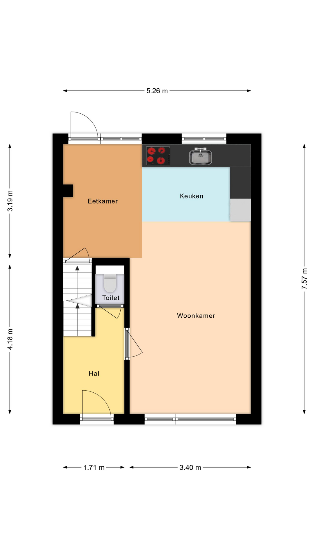 Hal/entree met trapopgang en nette toiletruimte met een hangend toilet. Lichte woonkamer met een prettige verdeling tussen zit- en eetgedeelte, een fijne plek om samen te zijn of lekker te ontspannen. Het eetgedeelte ligt om een hoekje, waardoor er een knusse, aparte ruimte ontstaat met toegang tot de achtertuin. De keukenruimte is praktisch ingedeeld en uitgerust met diverse inbouwapparatuur en biedt een uitzicht over de diepe achtertuin. Via de keuken is het souterrain bereikbaar, met extra bergruimte en een handige wasruimte.